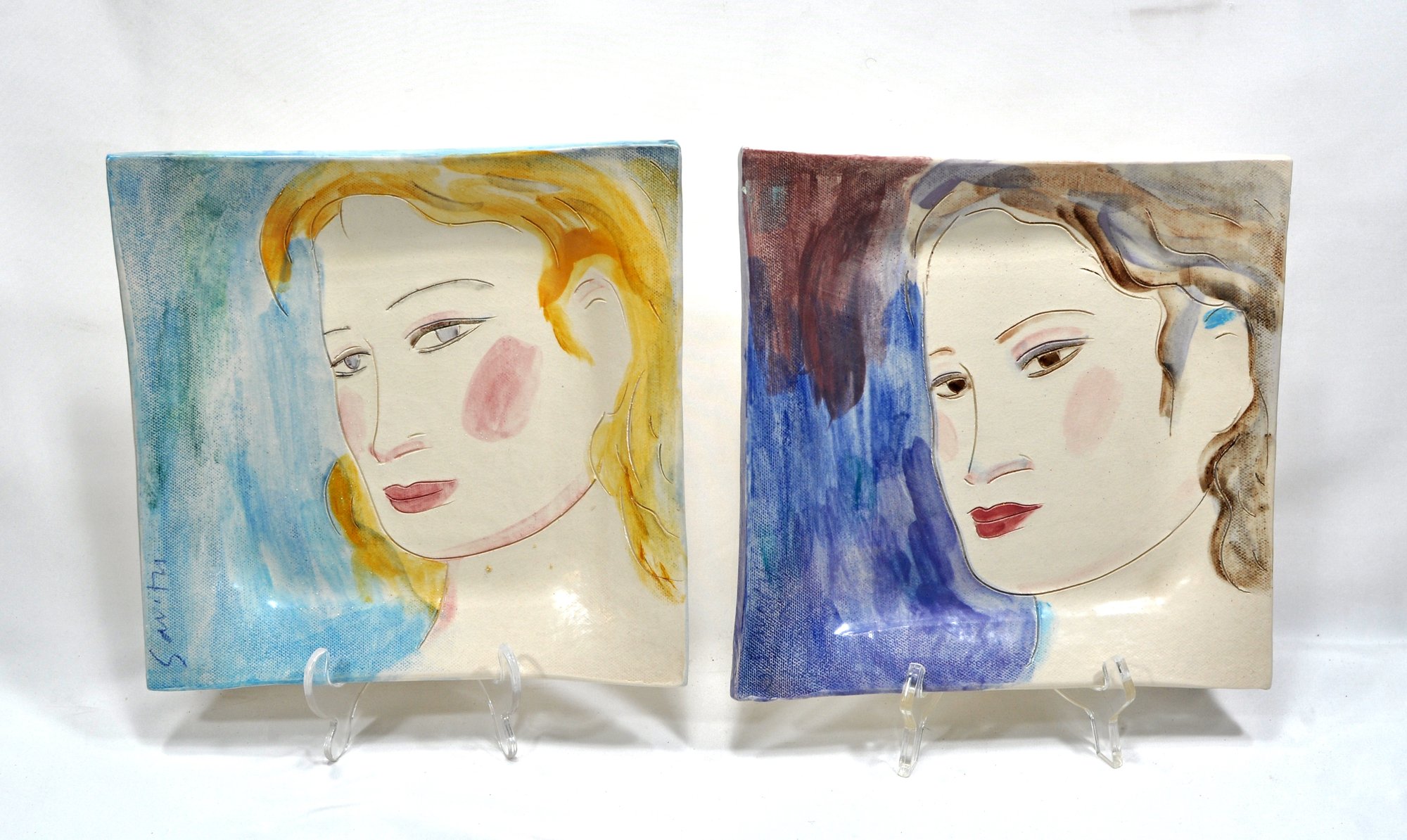 Hand painted and artist signed pottery trays with girl portraits.