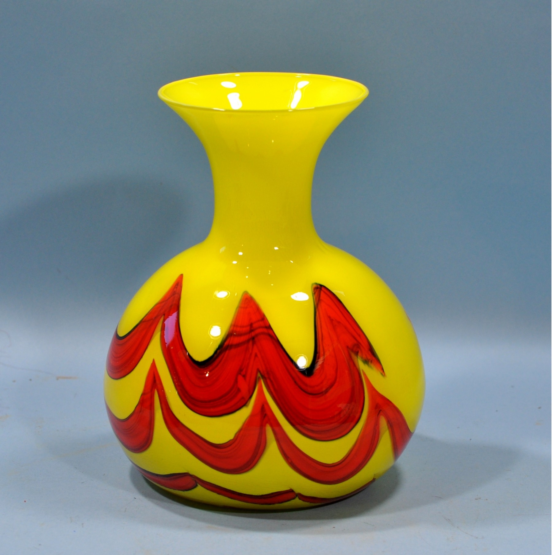Great egg yolk with red streaks glass vase of slightly deformed shape.