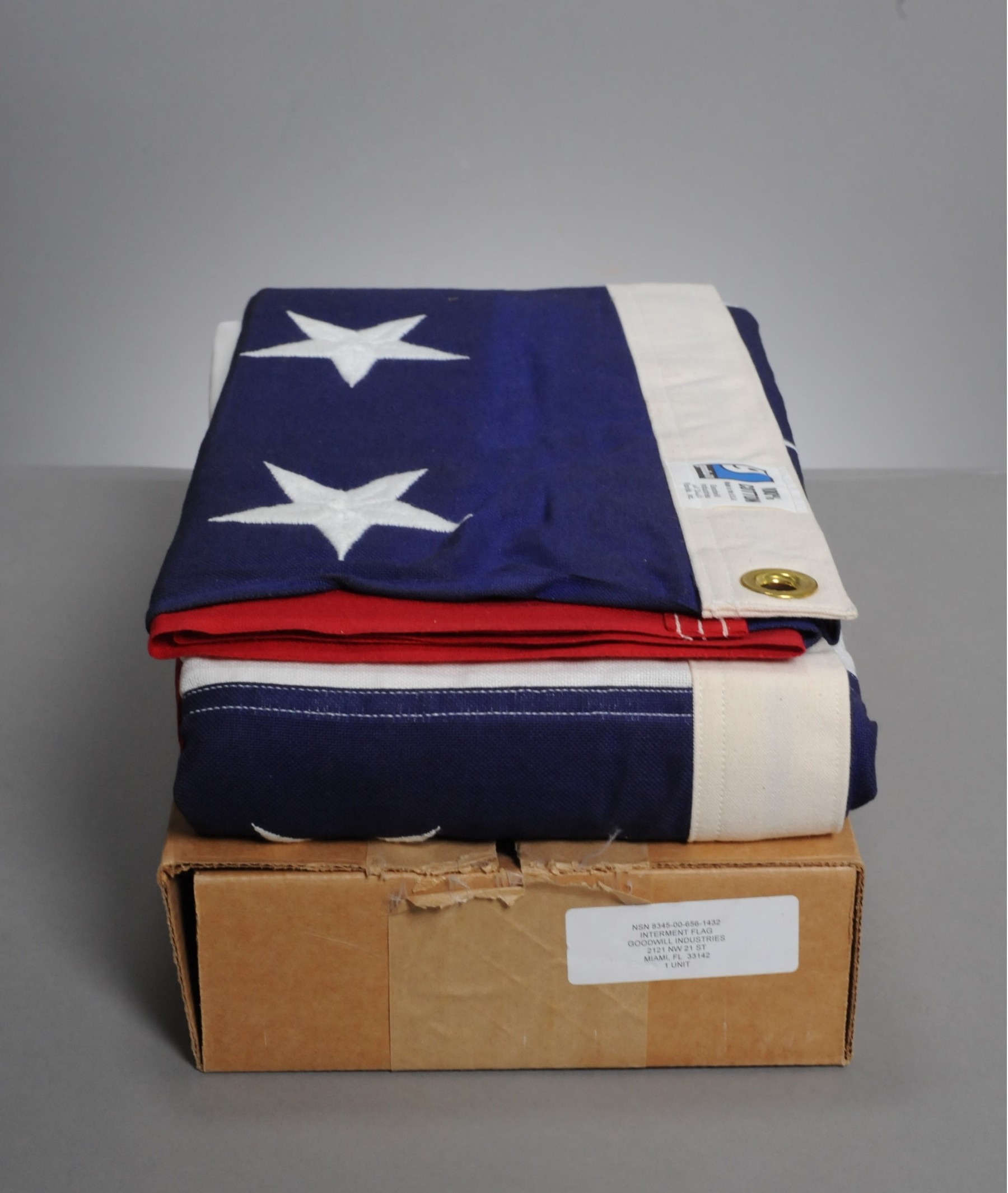 Also known as a burial or internment flag, this is the standard American flag that is used for retirement or memorial services of US veterans. It is made of 100% cotton. In pristine condition with original box.