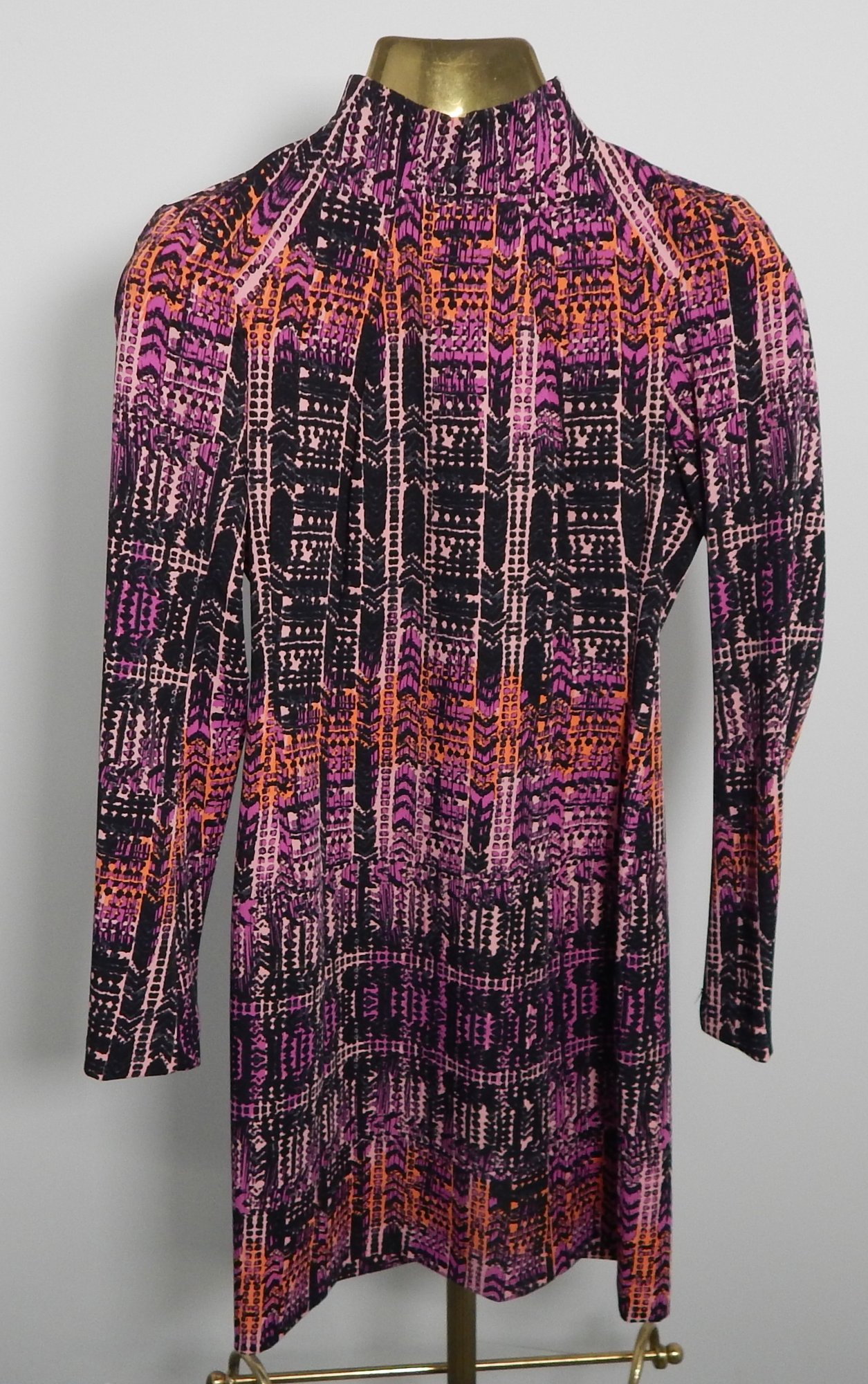 Purple, black, and orange long sleeved mock neck dress by Nanette Lepore. Made in the USA. Dress has a long-hidden back zipper for easy on and off. Sleeves are 17 1/2" from armpit to wrist. From armpit to hem measures 25 1/2". Dress is made from 95% polyester, and 5% spandex. Great condition. Dry clean only. Shipping is available.