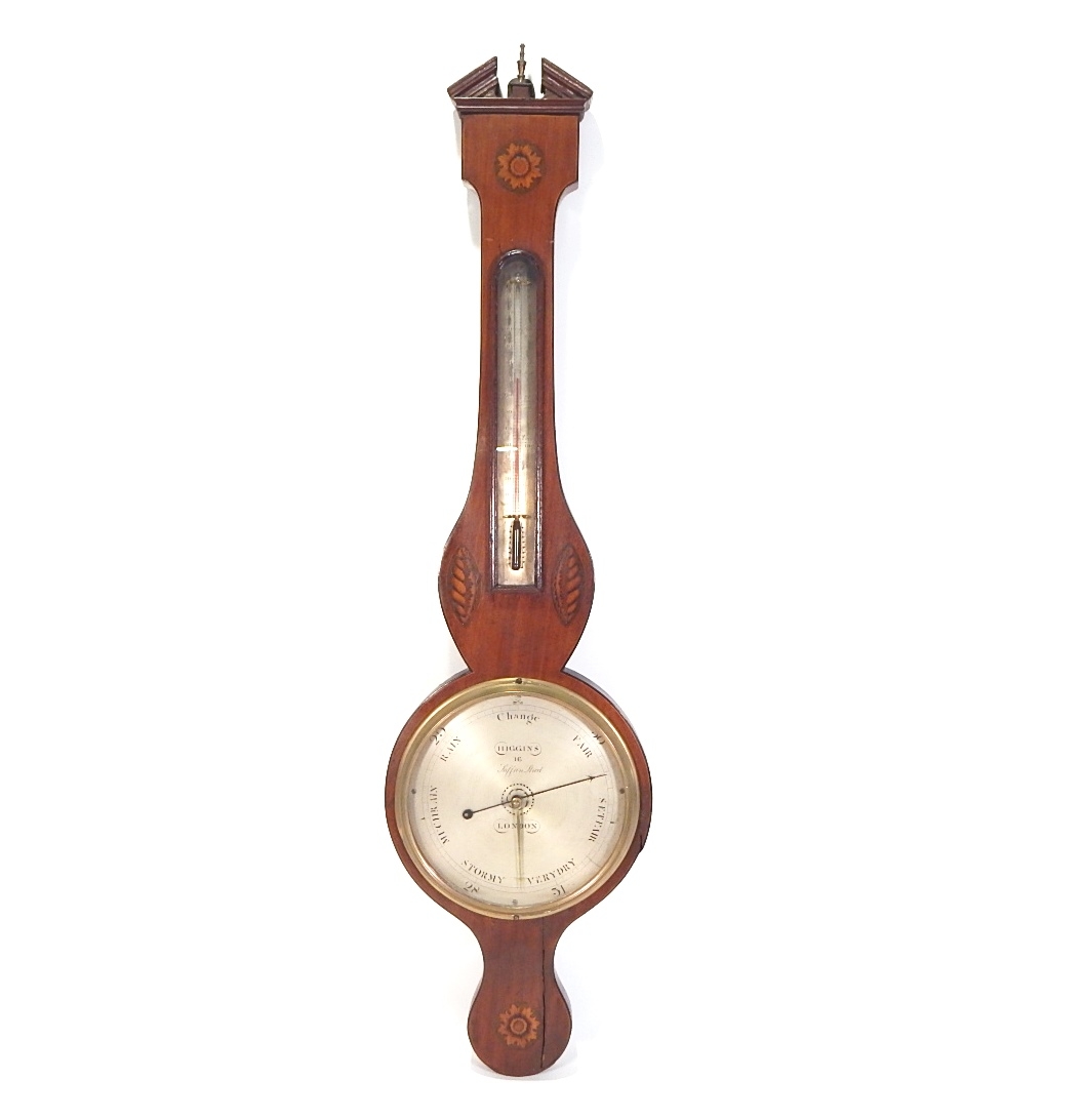 Large antique rosewood wheel barometer with thermometer by Higgins, London.