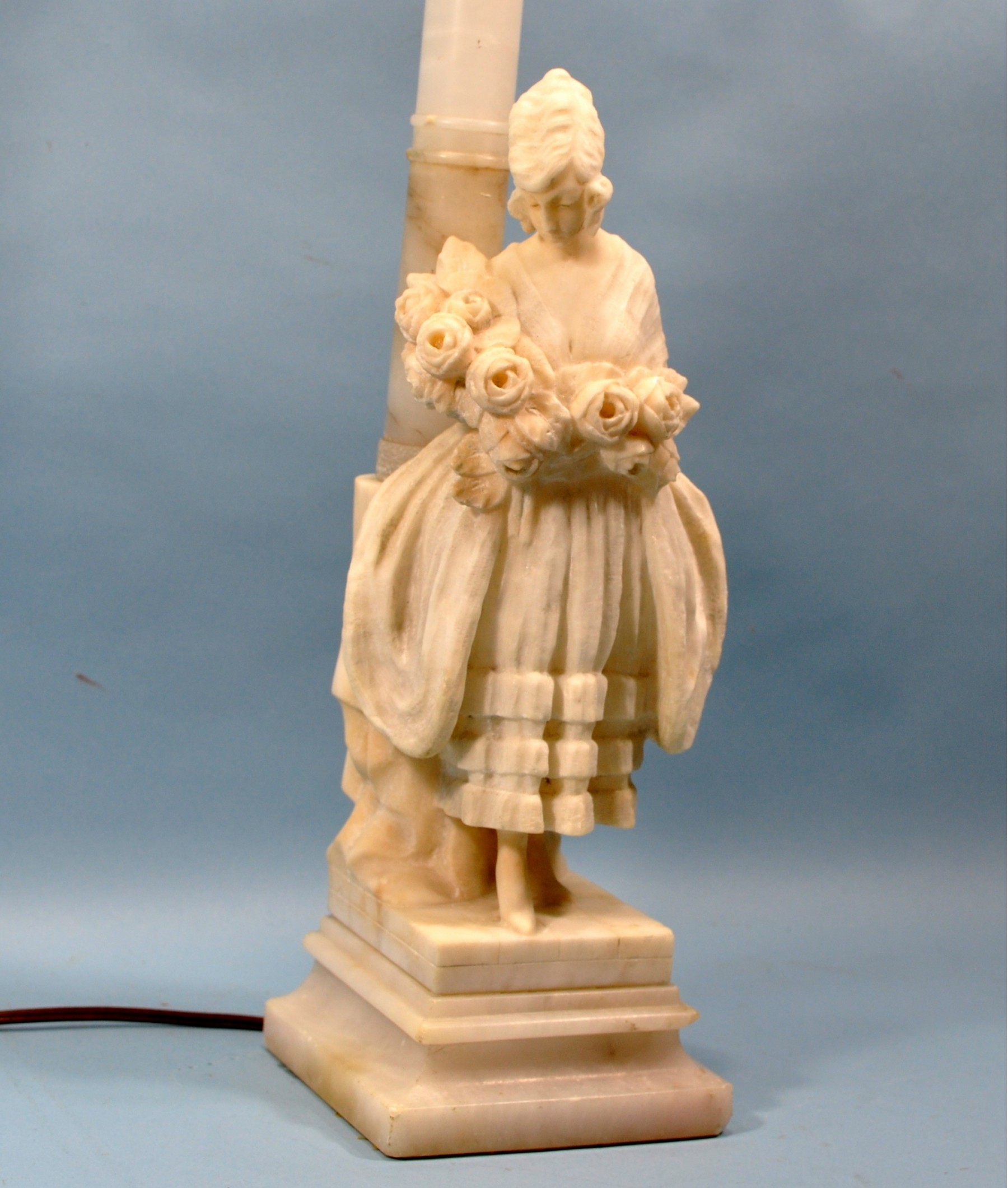 Antique or vintage lamp alabaster sculpture of woman with flowers.