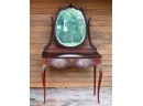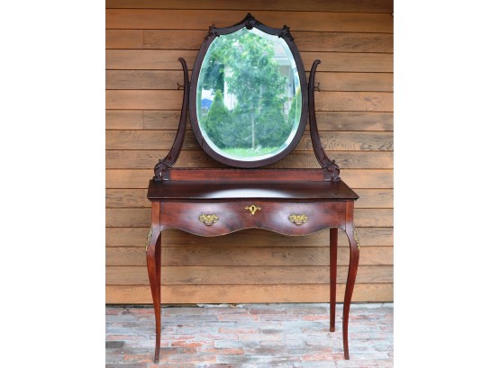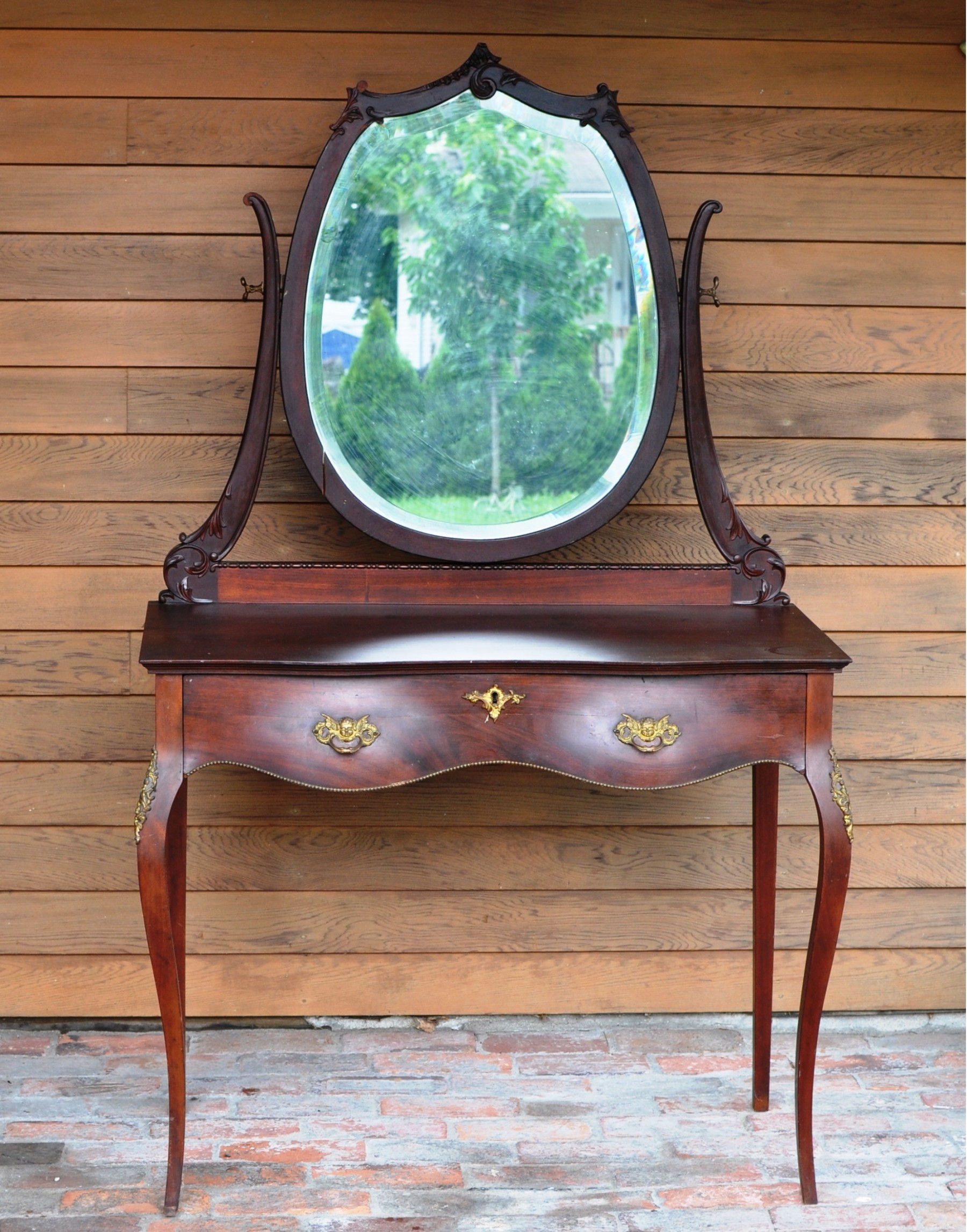 Antique one drawer princess dresser with faceted mirror and brass hardware.