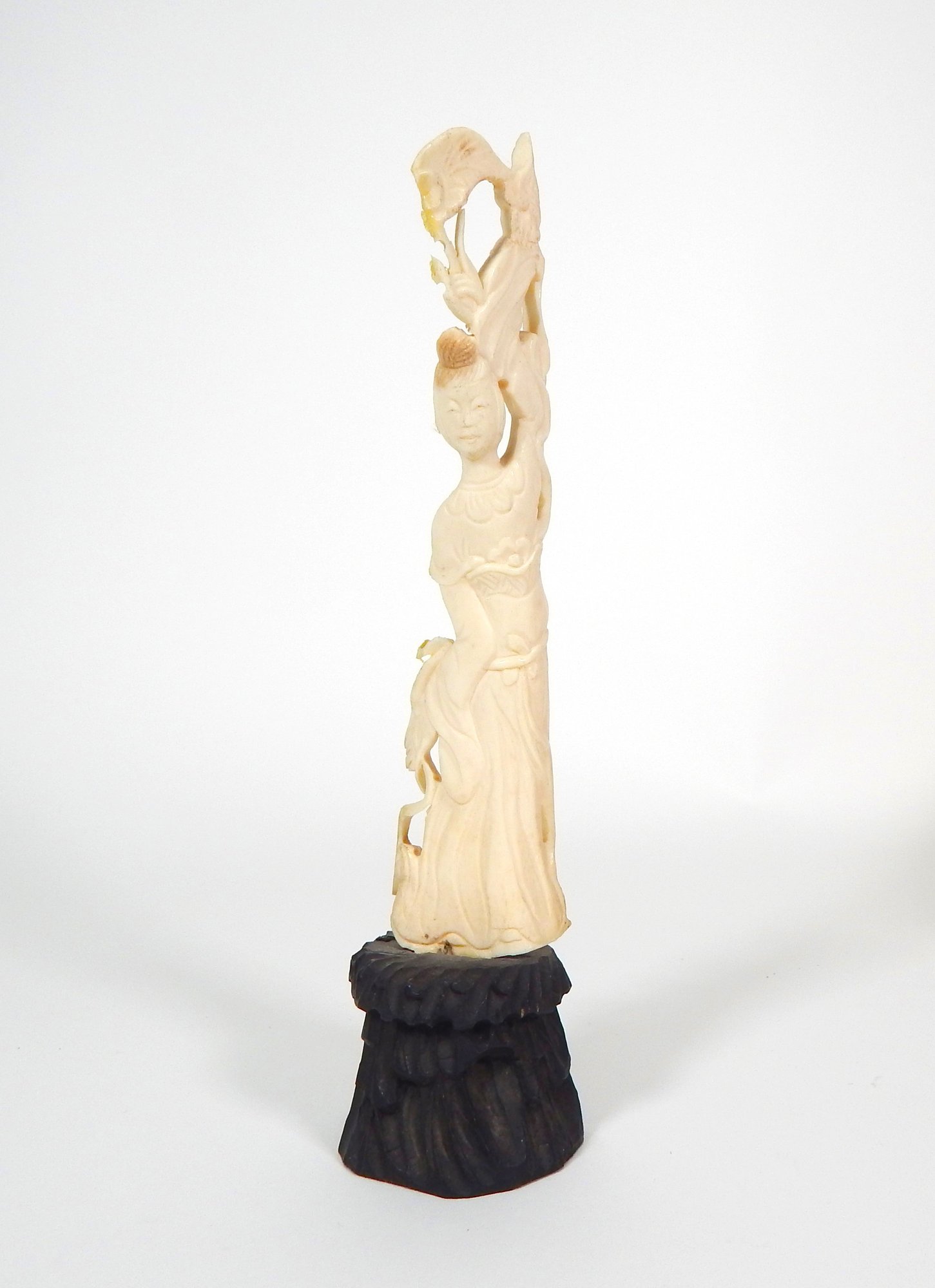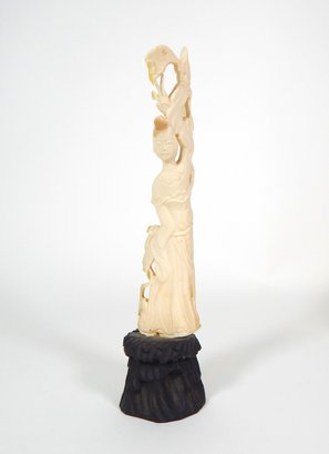 Hand carved figure of woman on carved wood base.