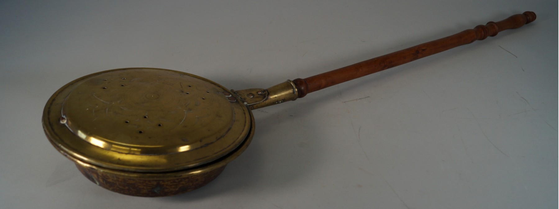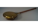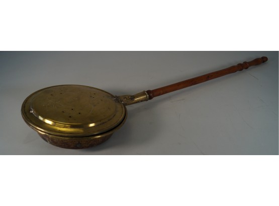 12 inch round brass bed warmer. Wood handle. Etched design on the cover. The hinge is a bit off, as shown.