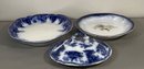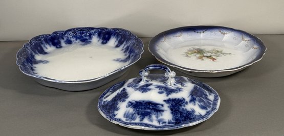 Antique blue and white transferware serving dishes. Includes a covered dish and two plates. The largest plate measures approximately 17.75 inches wide.