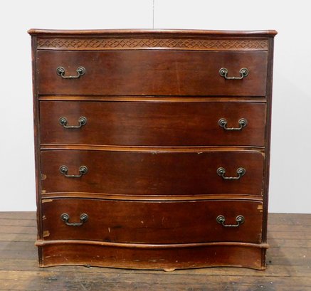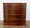 This antique bow-front chest of drawers features a classic design with four graduated drawers, each equipped with decorative brass handles.