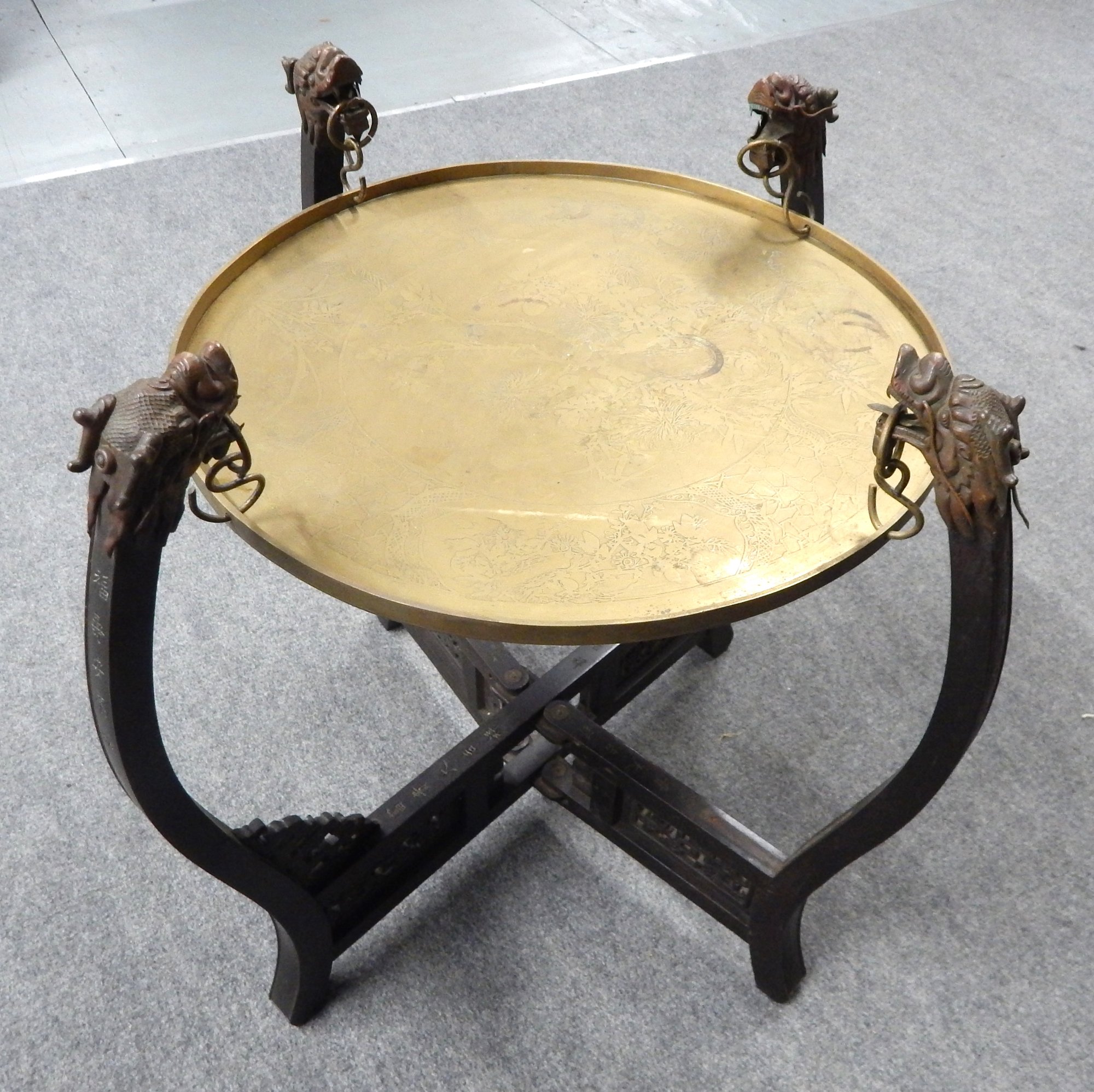 Etched brass top, brass dragon heads, carved wood legs, inscriptions.