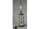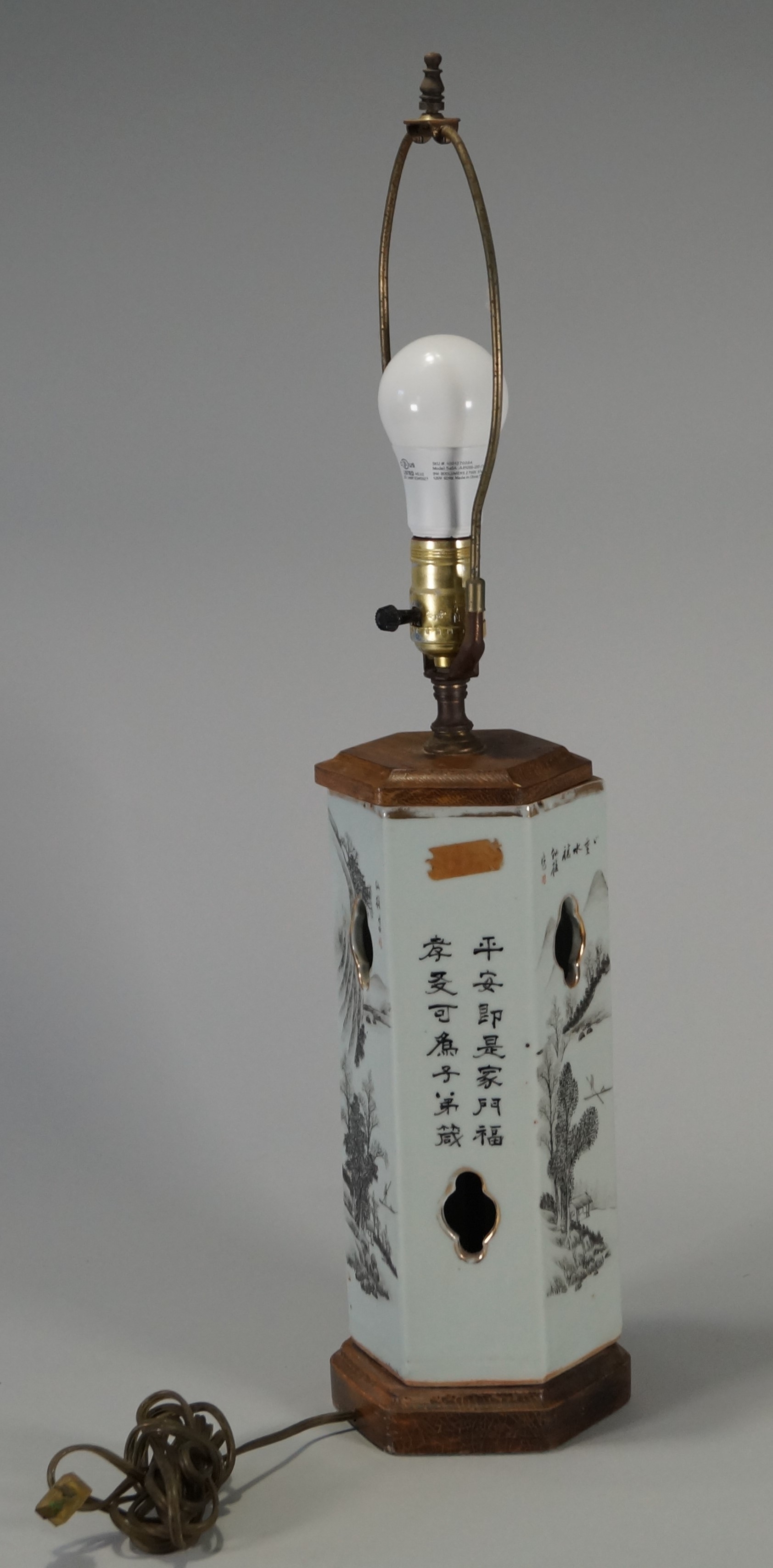 Working lamp with cream colored base. Asian writing with cutouts rimmed in gold trim.