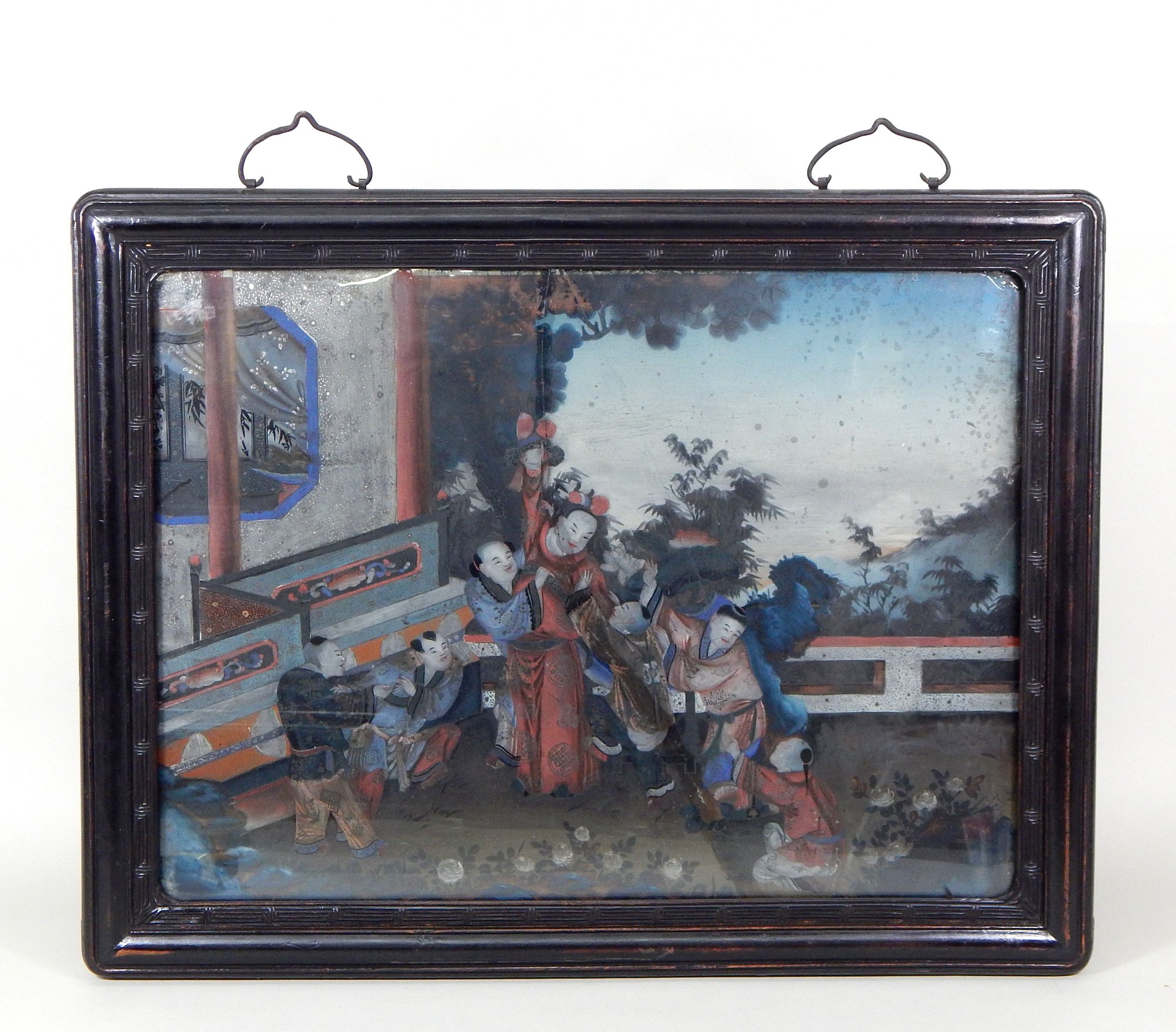 Antique Chinese Reverse Painted Courtyard Scene.