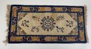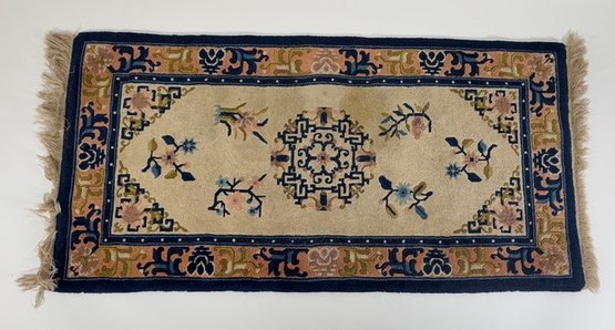 A Chinese rug with a cream-colored field and a navy blue border. The rug features a central medallion and floral motifs. It measures approximately 24.75" x 50.5".