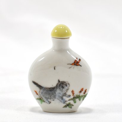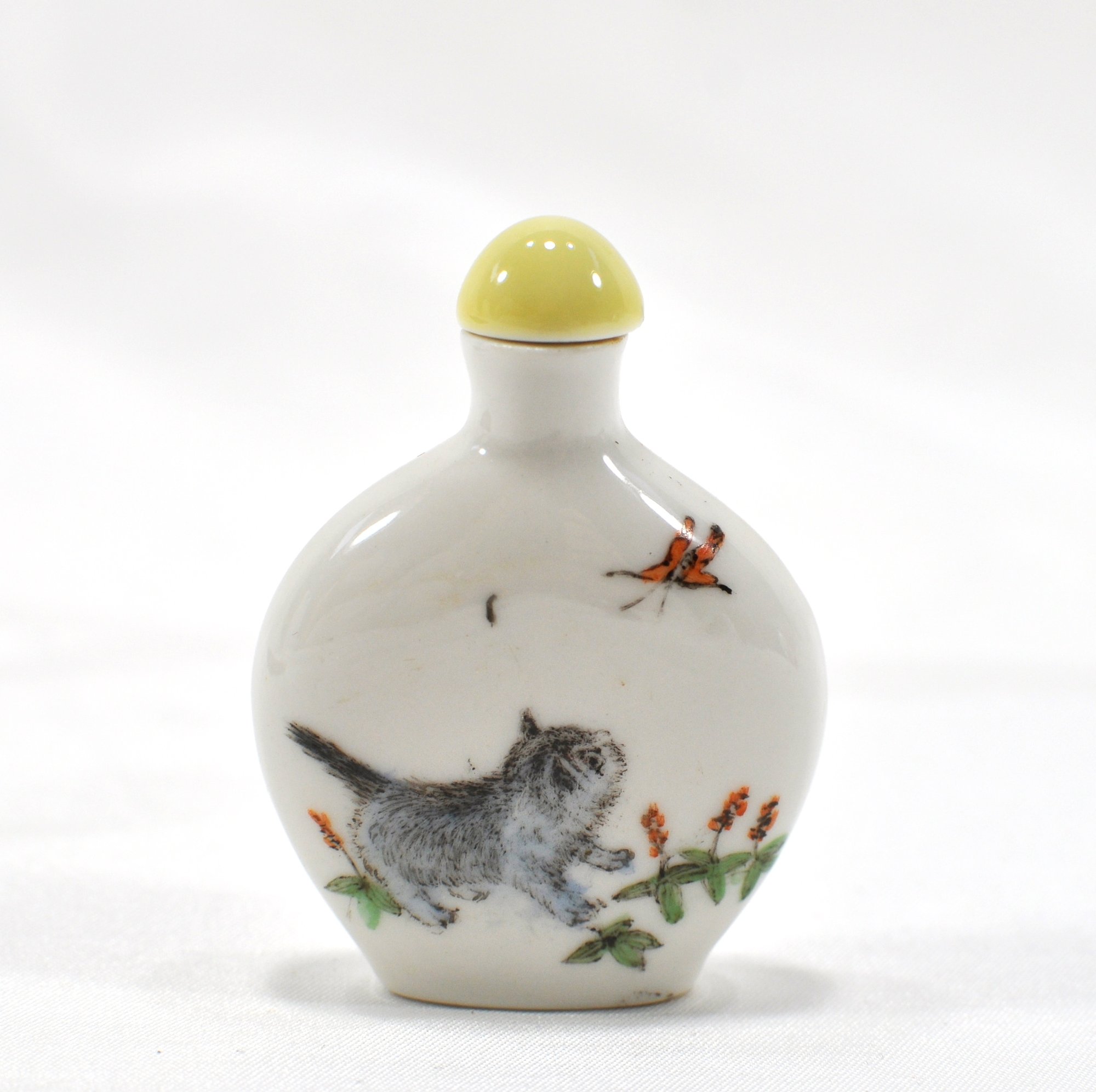 With polychrome decoration of a cat and butterfly on one side, and symbols on other side.