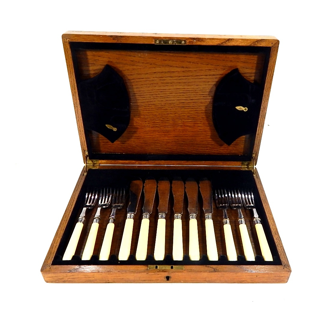 Fine English fish serving set with 6 forks and knives, hallmarked.