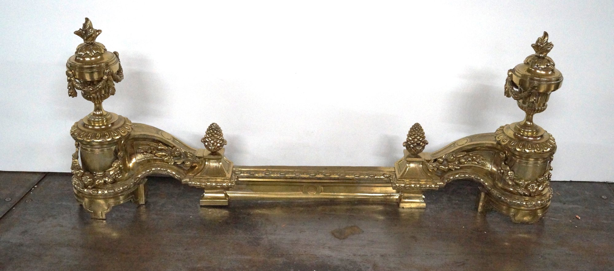 Ornate brass fireplace fender measuring 36"w x 15"h. Some tarnish to the brass in spots, but otherwise in good condition. See photos for details.