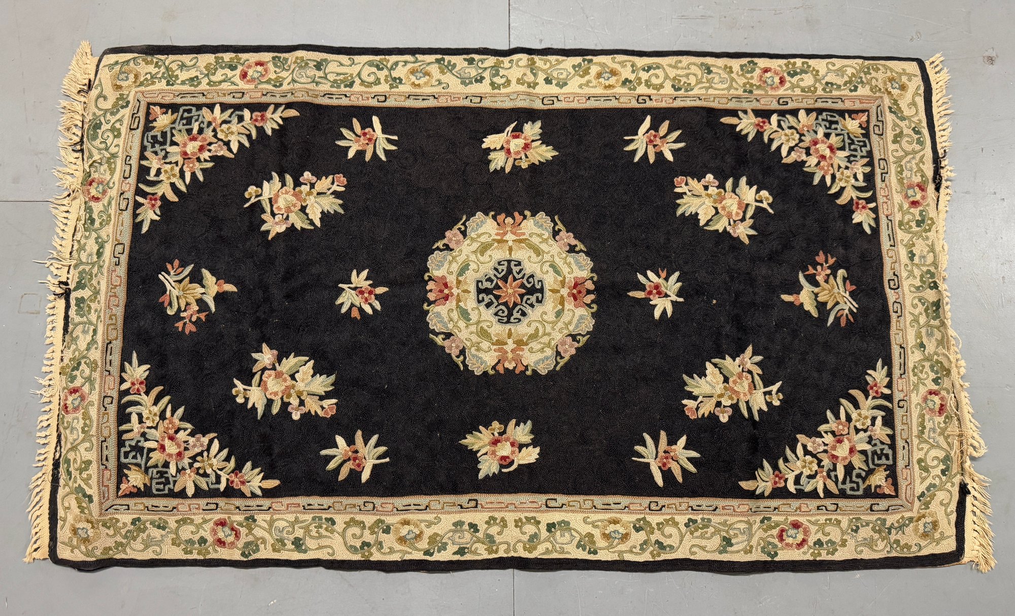 A decorative rug with a black background and floral pattern in beige, green, and red. It features a central medallion and repeating floral motifs. The rug has tassels on each end and measures approximately 35" x 60".