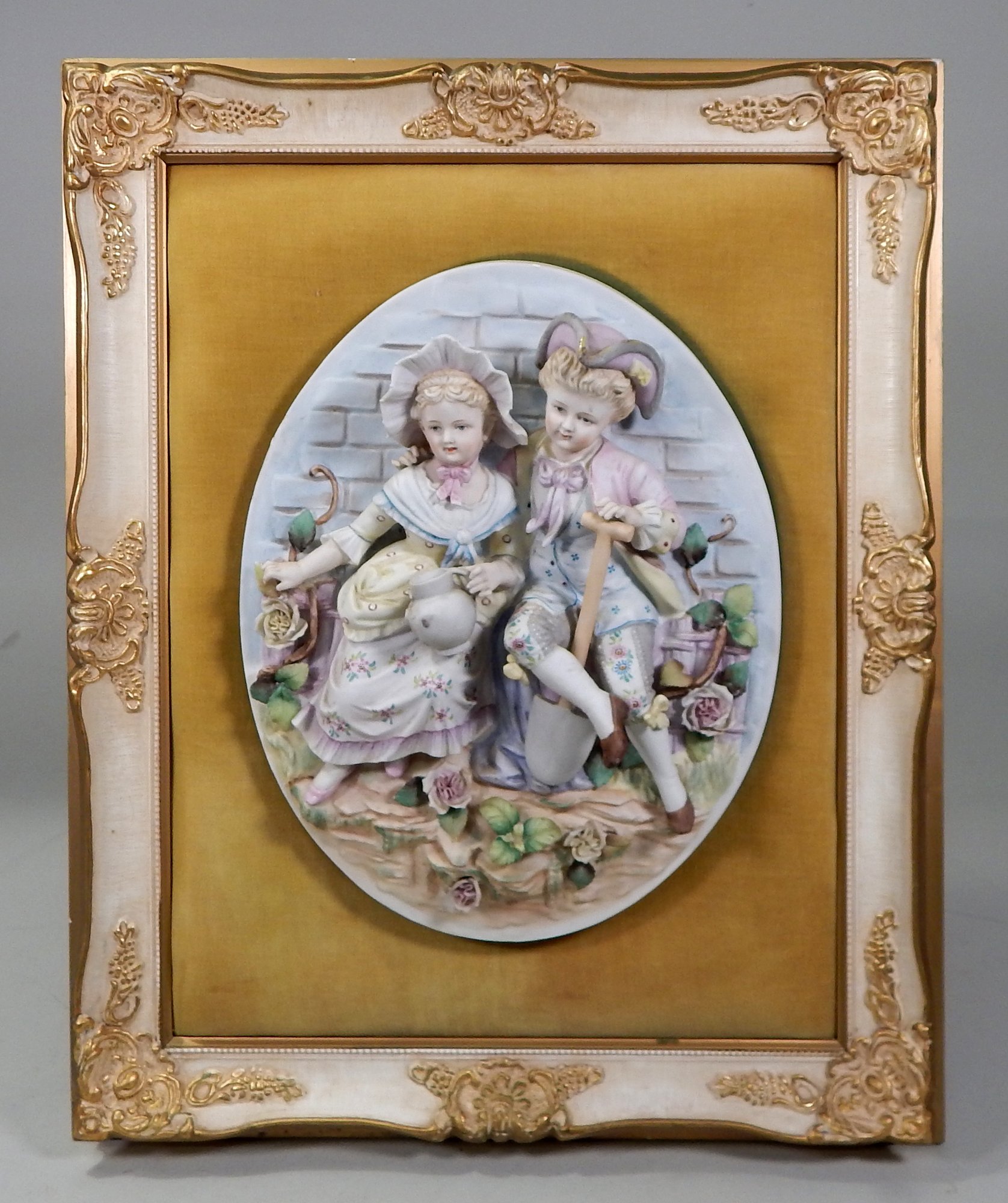 Cute antique bisque oval plaque with frame.