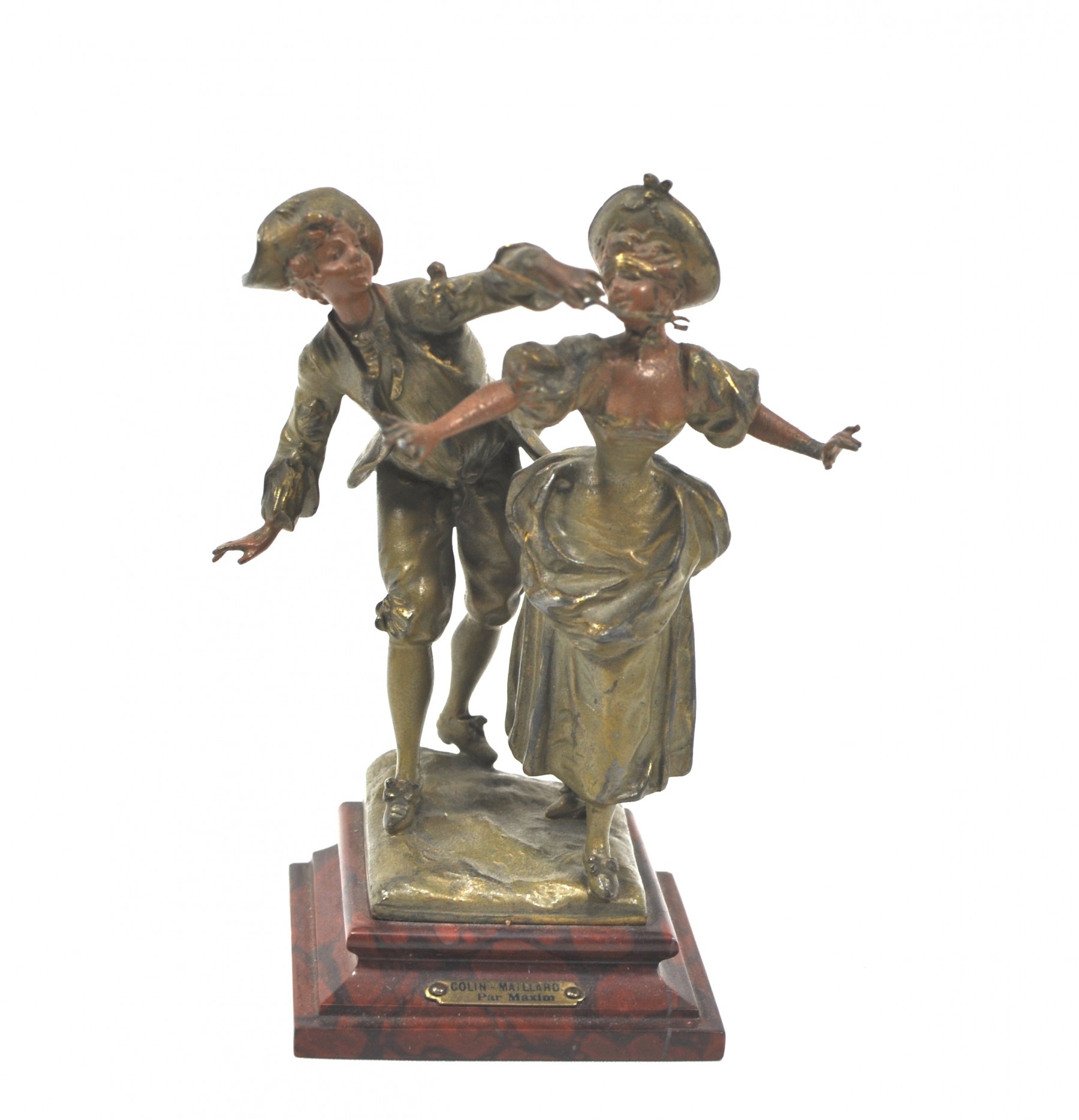 Colin-Maillard Per Maxim charming small bronze statue of boy tickling a girl with the stick.