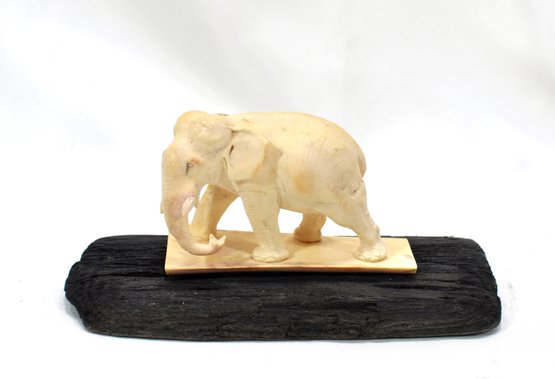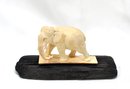 Hand carved bone elephant on wood base.