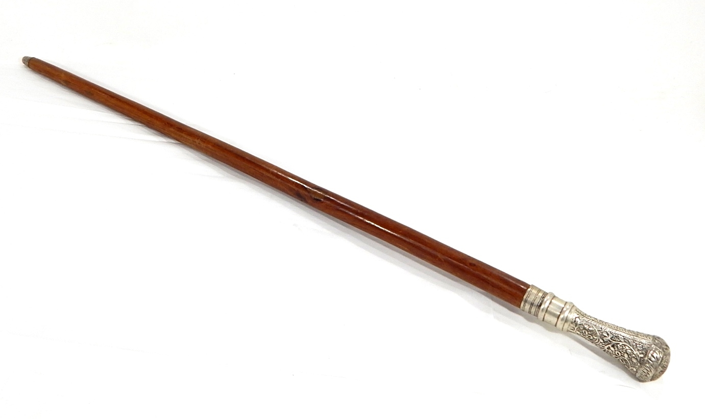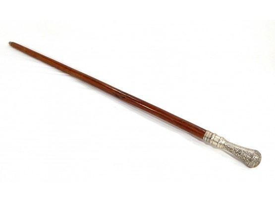Antique cane decorated with silvered metal ornate repousse handle.