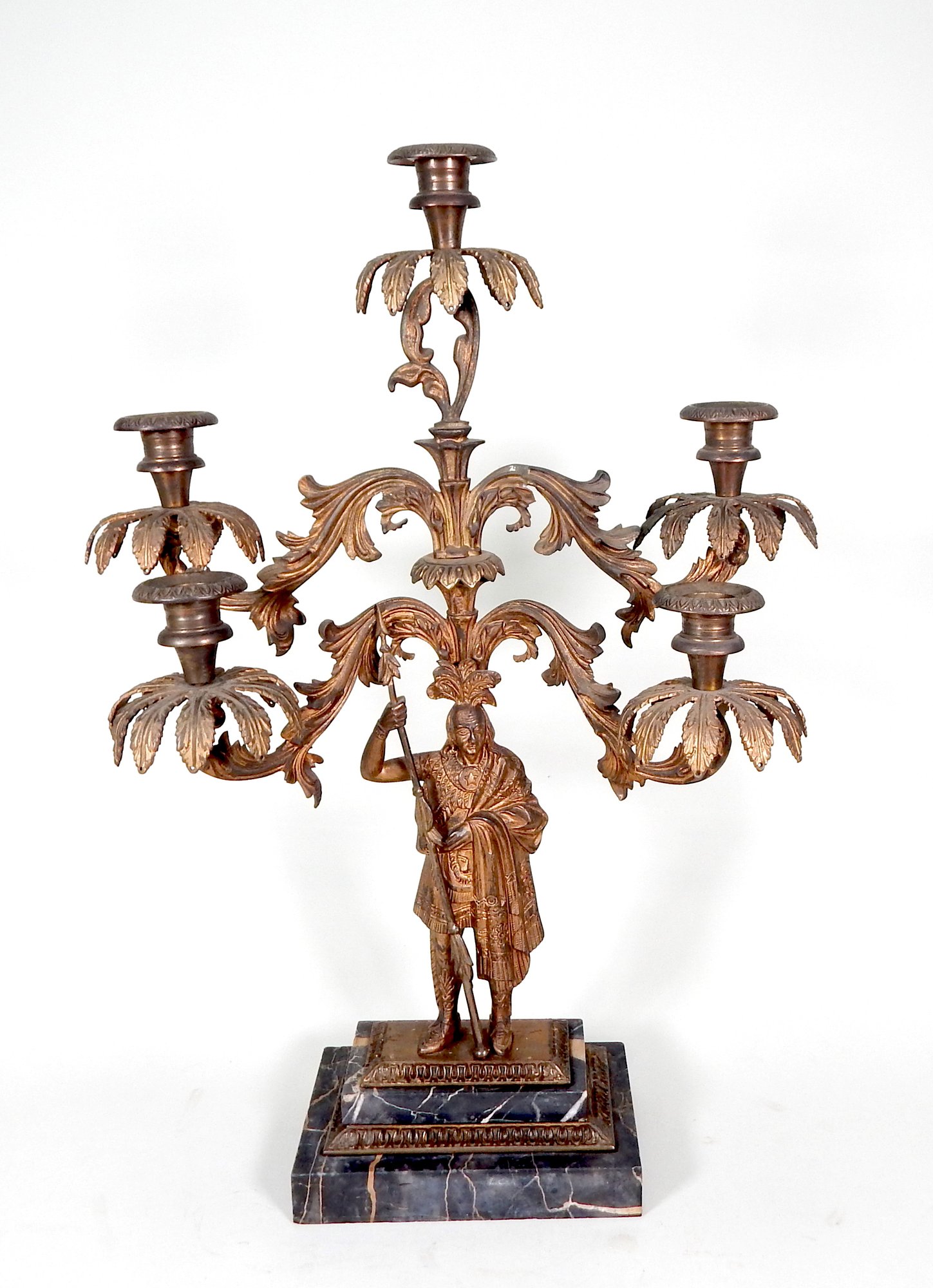 Antique Indian Warrior Figure Gilt Bronze Girandole candle holder on marble base.