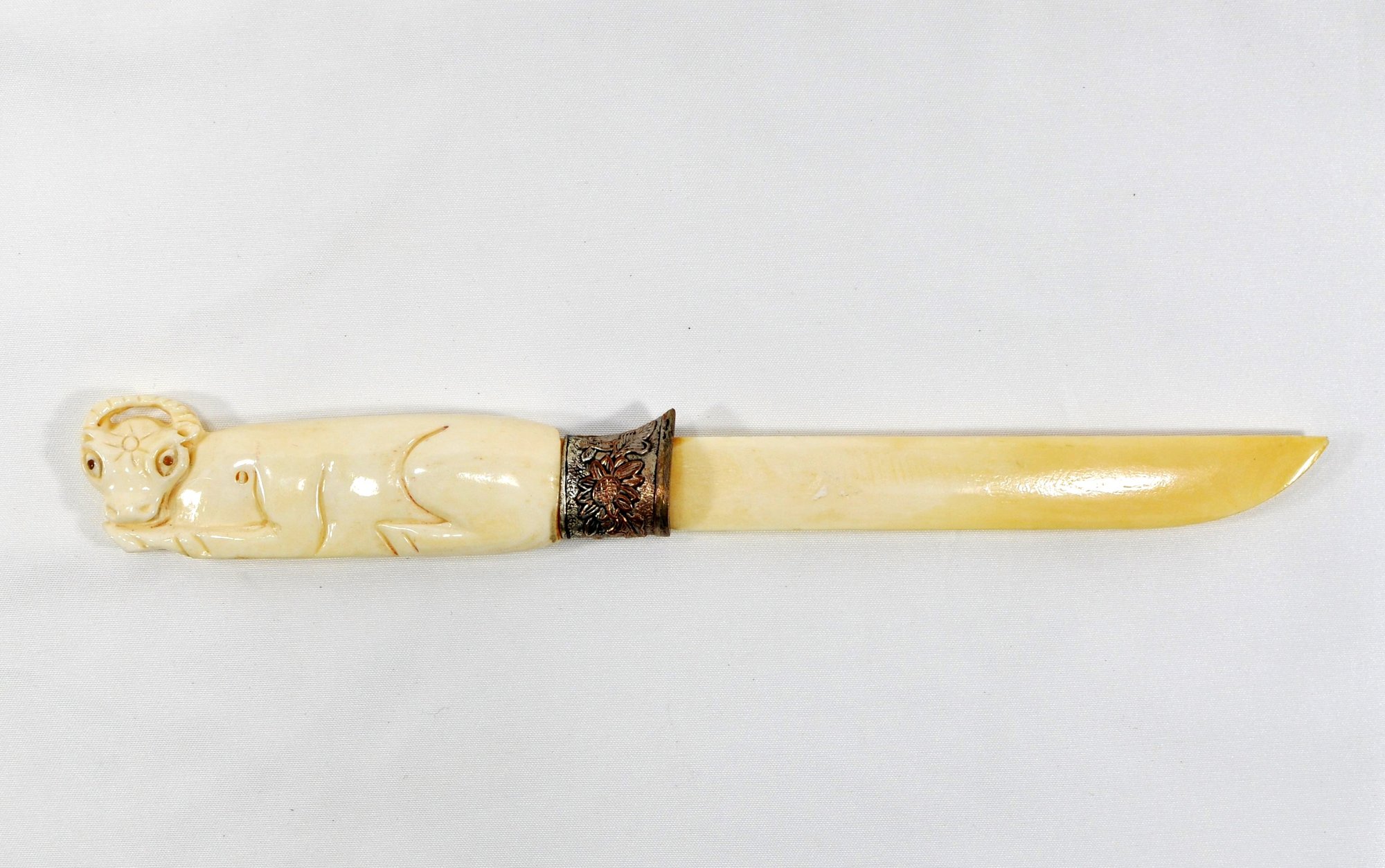 Antique hand carved bone letter opener with silver-plated ring.