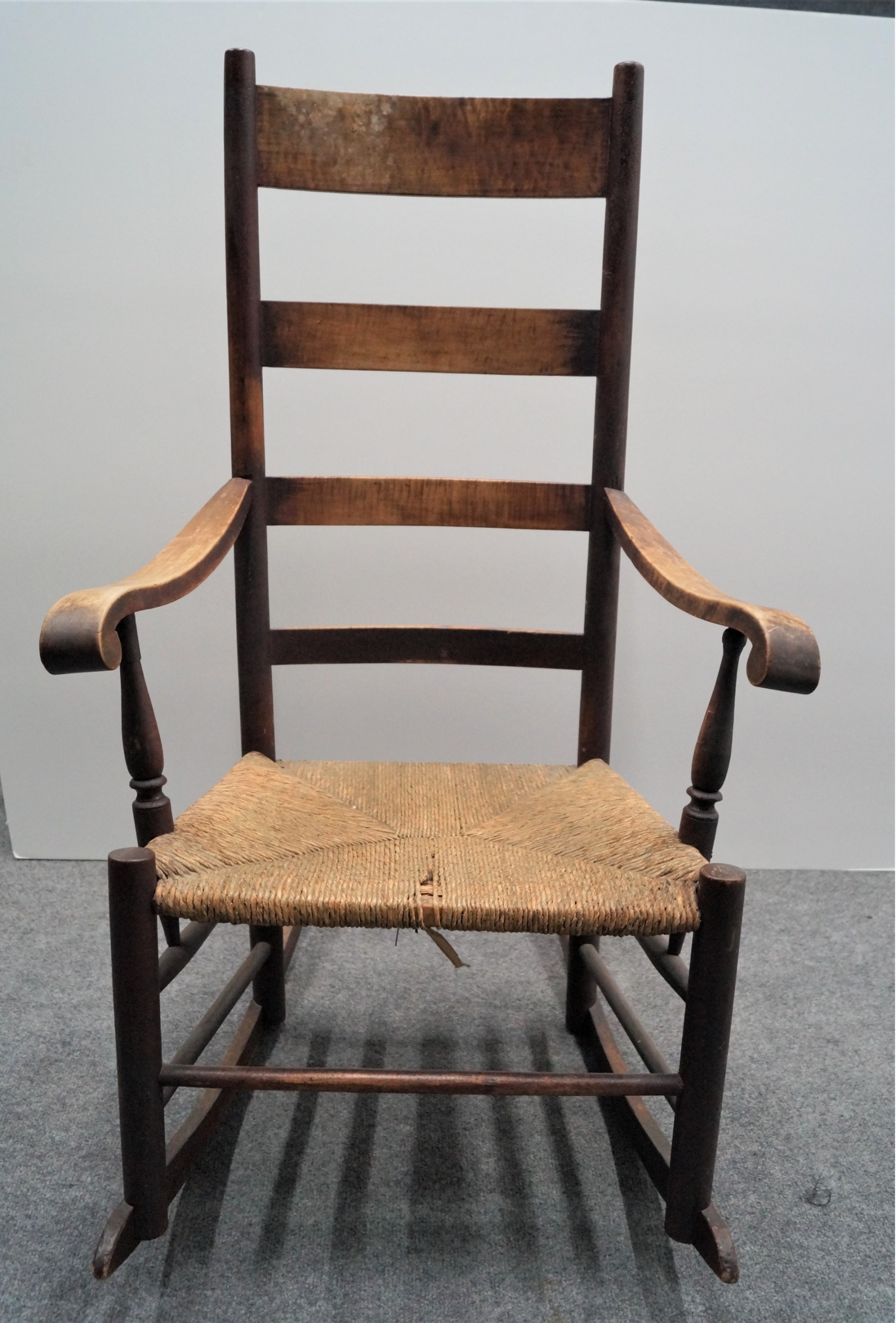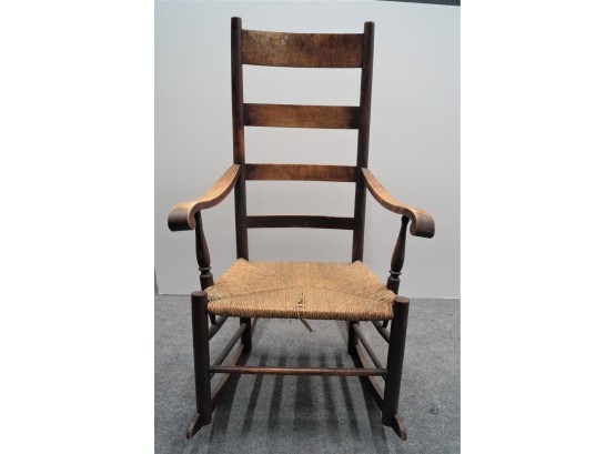 Listed is an antique rocking chair with rush seat. The seat needs to be repaired and the arms are a bit wobbly ; otherwise in good condition. See photos for details.