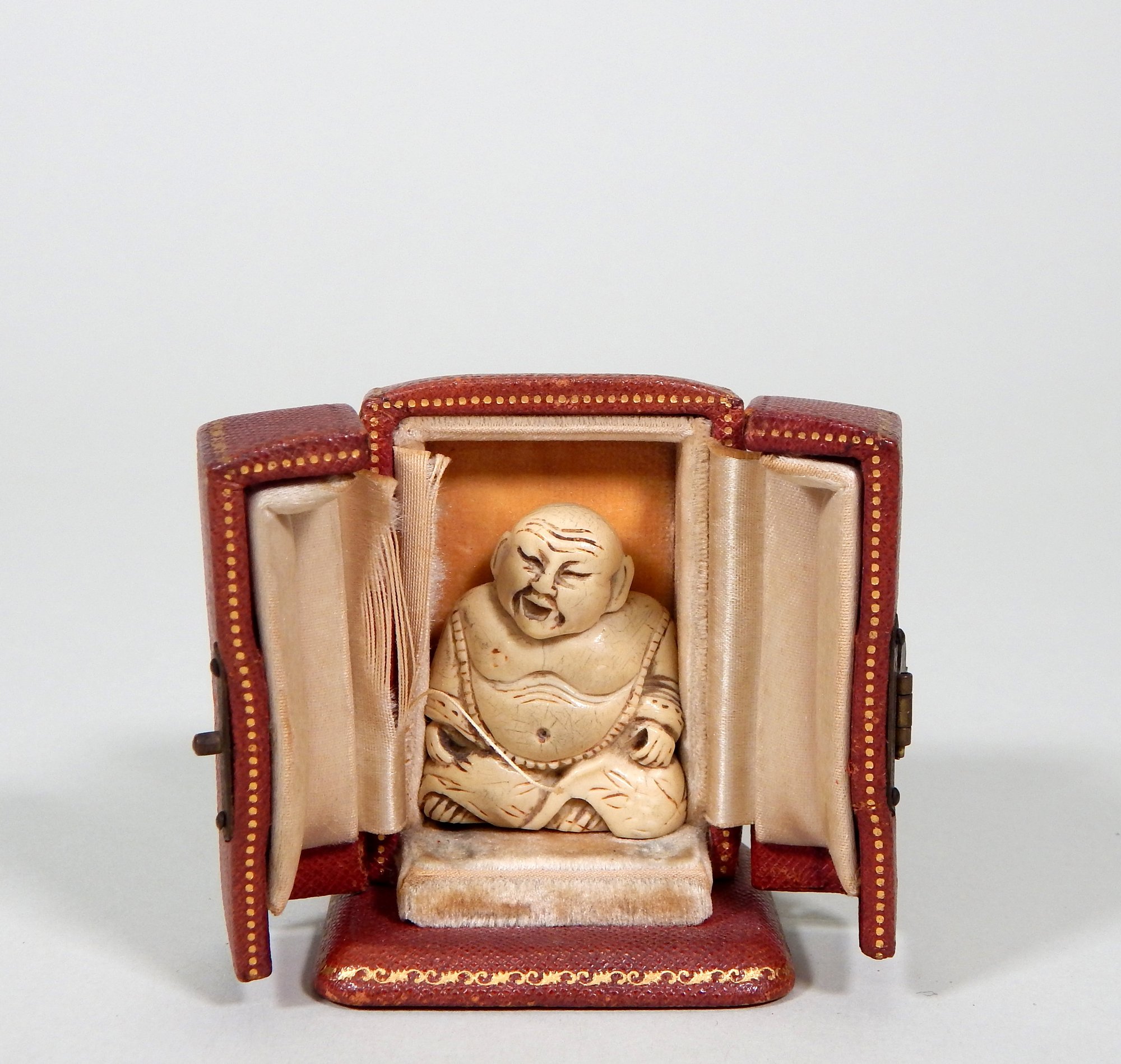 Antique hand carved bone Buddha figure housed in original Cartier case.
