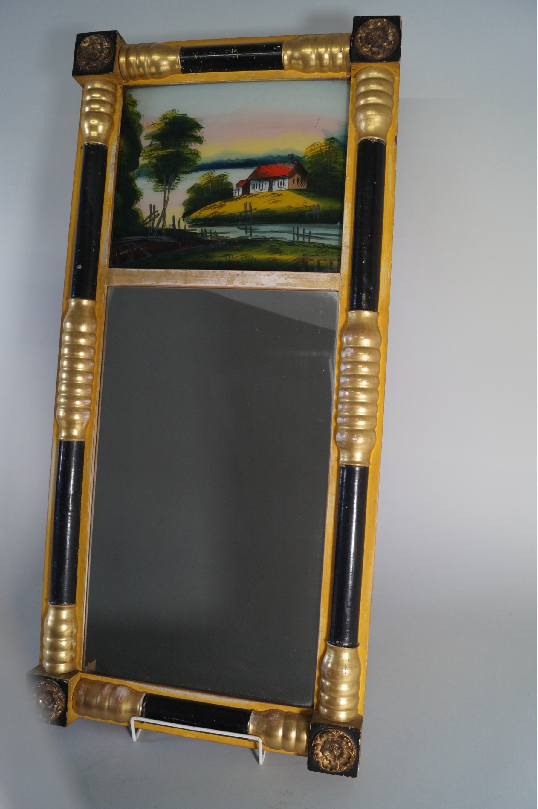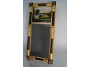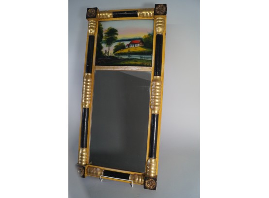 Listed is a lovely antique Federal style mirror with black and gold paint, applied brass rosettes at corners and a reverse glass painting of a pastoral scene. It measures 29.75"h x 14"w and is in very good vintage condition, showing wear consistent with age.