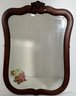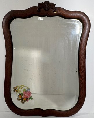 Antique oak framed mirror with decorative crest. Dimensions: 27.5 x 20.5 inches.