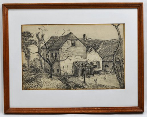 Antique drawing of a farm house and chickens.