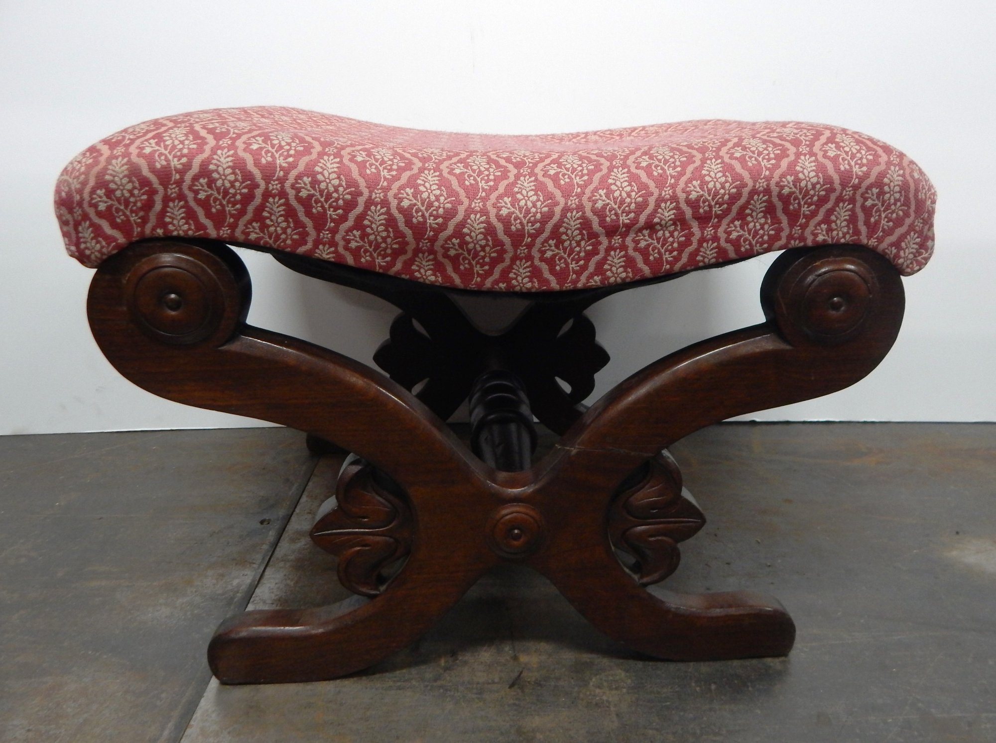 Solid dark wood ottoman with upholstered seat. Measures: 23"w x 17"d x 15"h. There were2 repairs made on the underside of 2 legs. These repairs were very well done with a metal plate securing each crack as seen in the attached photos. There is also another crack that seems minor and looks to be repaired with glue. Upholstered seat needs more stuffing.
