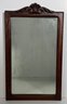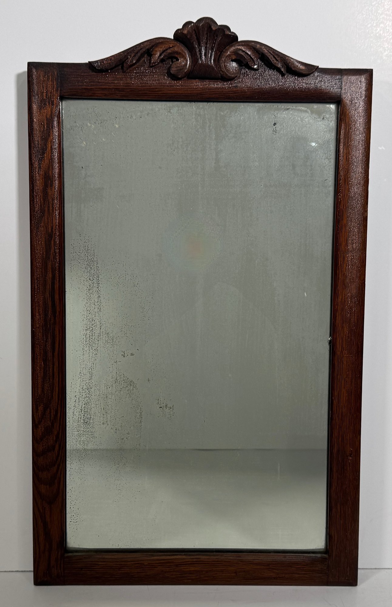 Antique rectangular mirror with a dark wood frame and decorative carved crest. Dimensions: 24 x 14.5 inches.