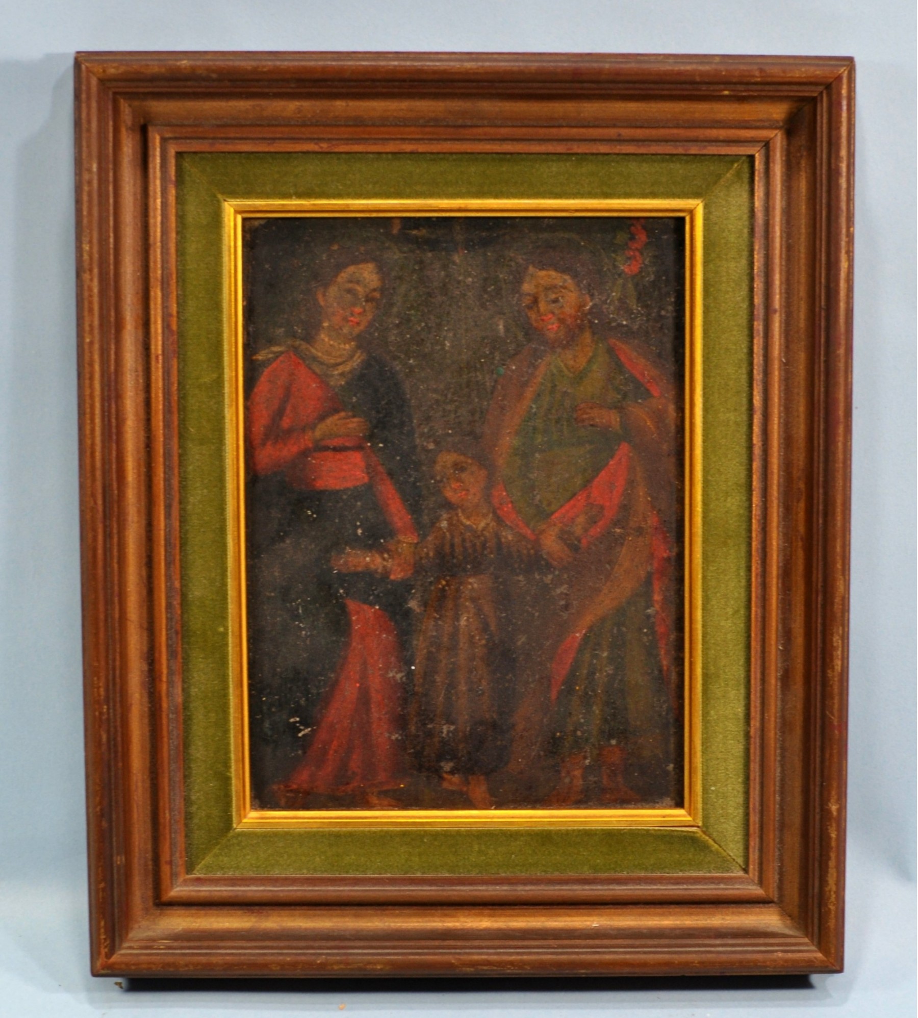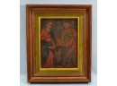 Framed antique oil painting on tin depicting religious figures.