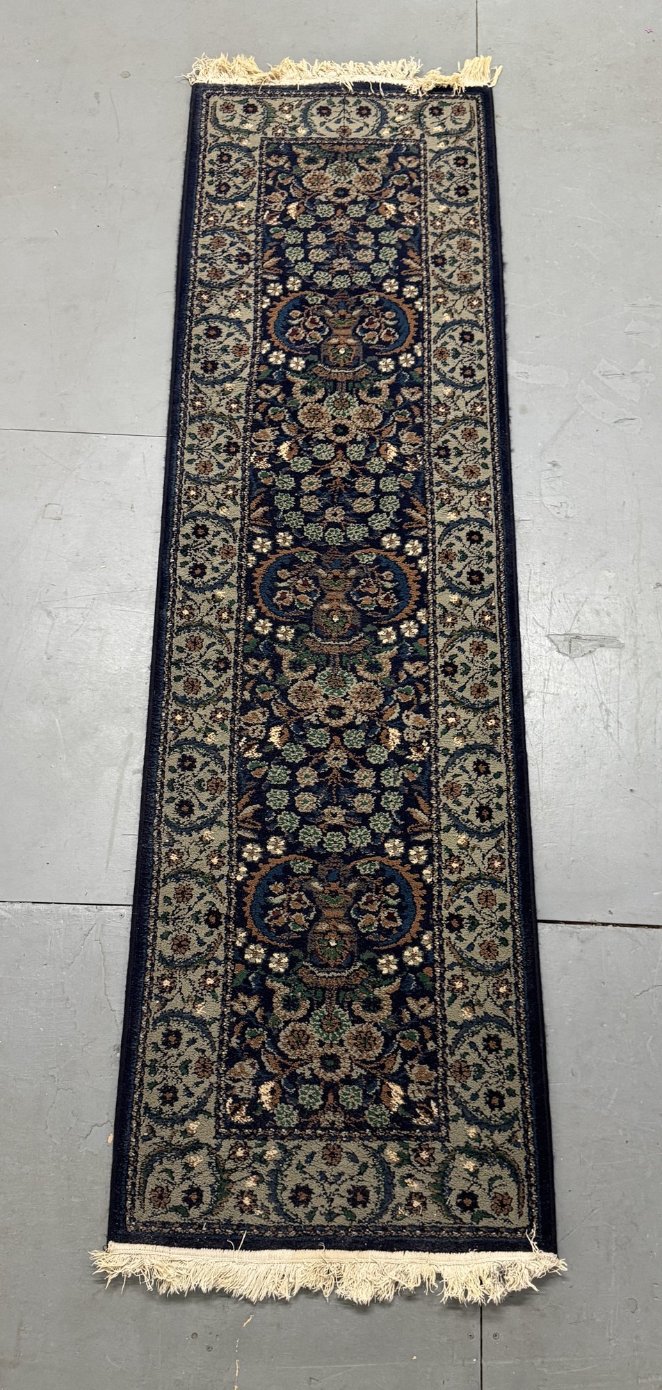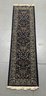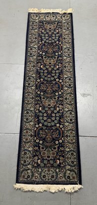 A beautiful runner rug with an intricate, repeating pattern in shades of blue, green, and beige on a dark navy background. Measures approximately 24.5" x 84.12". Features fringed edges.