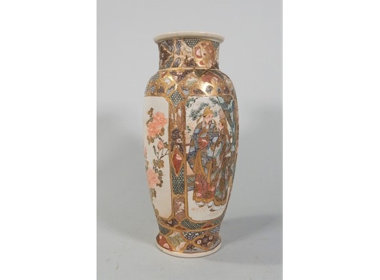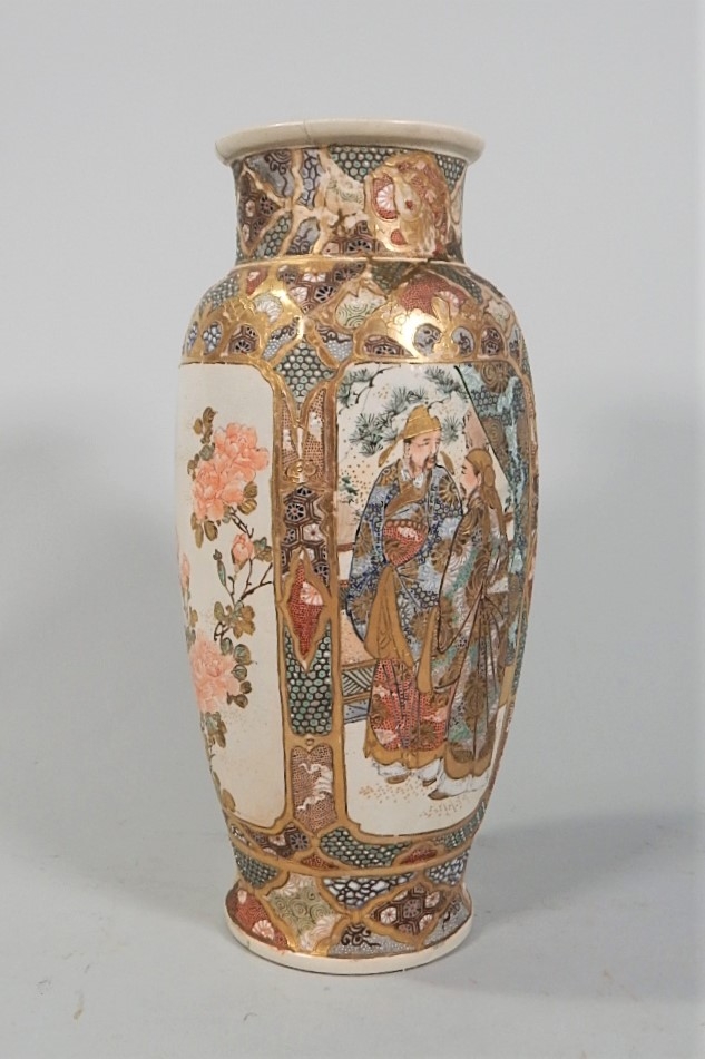 Listed is an antique c. late 1800's Japanese Satsuma vase beautifully decorated and rich in detail. It has been repaired and there are cracks, but it is still a lovely piece. It measures 11.25" high. See photos for details.