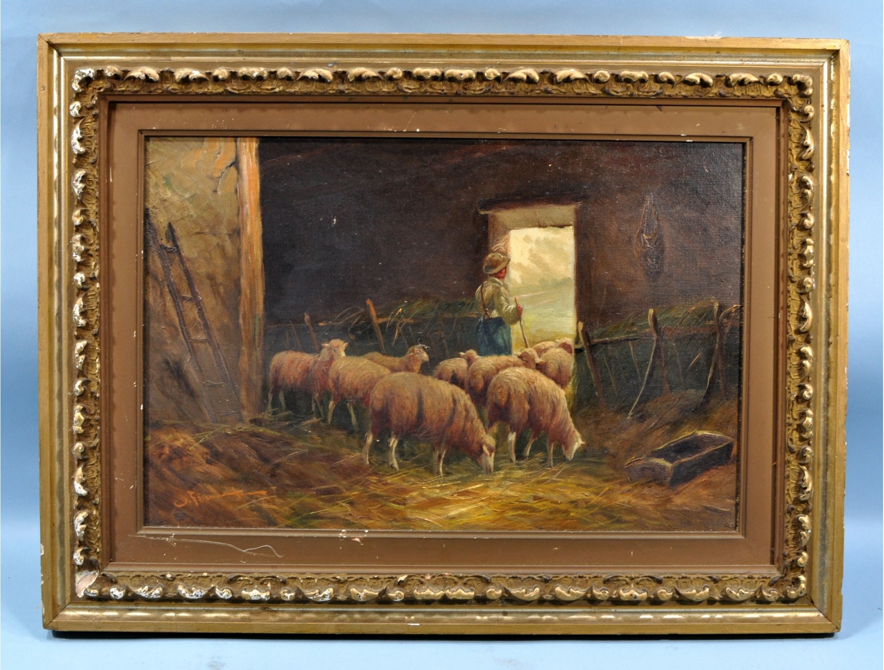 Antique oil painting by unidentified artist. Signed on front lower left (pic 4).