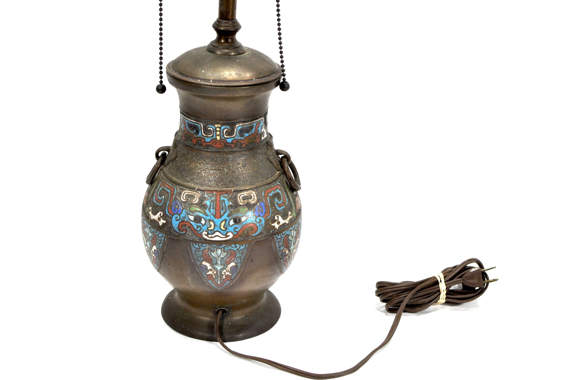 Antique early 1900's Japanese enameled bronze vase made into a lamp, exhibiting ringed handles on both sides, a stylized dragon and floral motif, and a signed bottom.