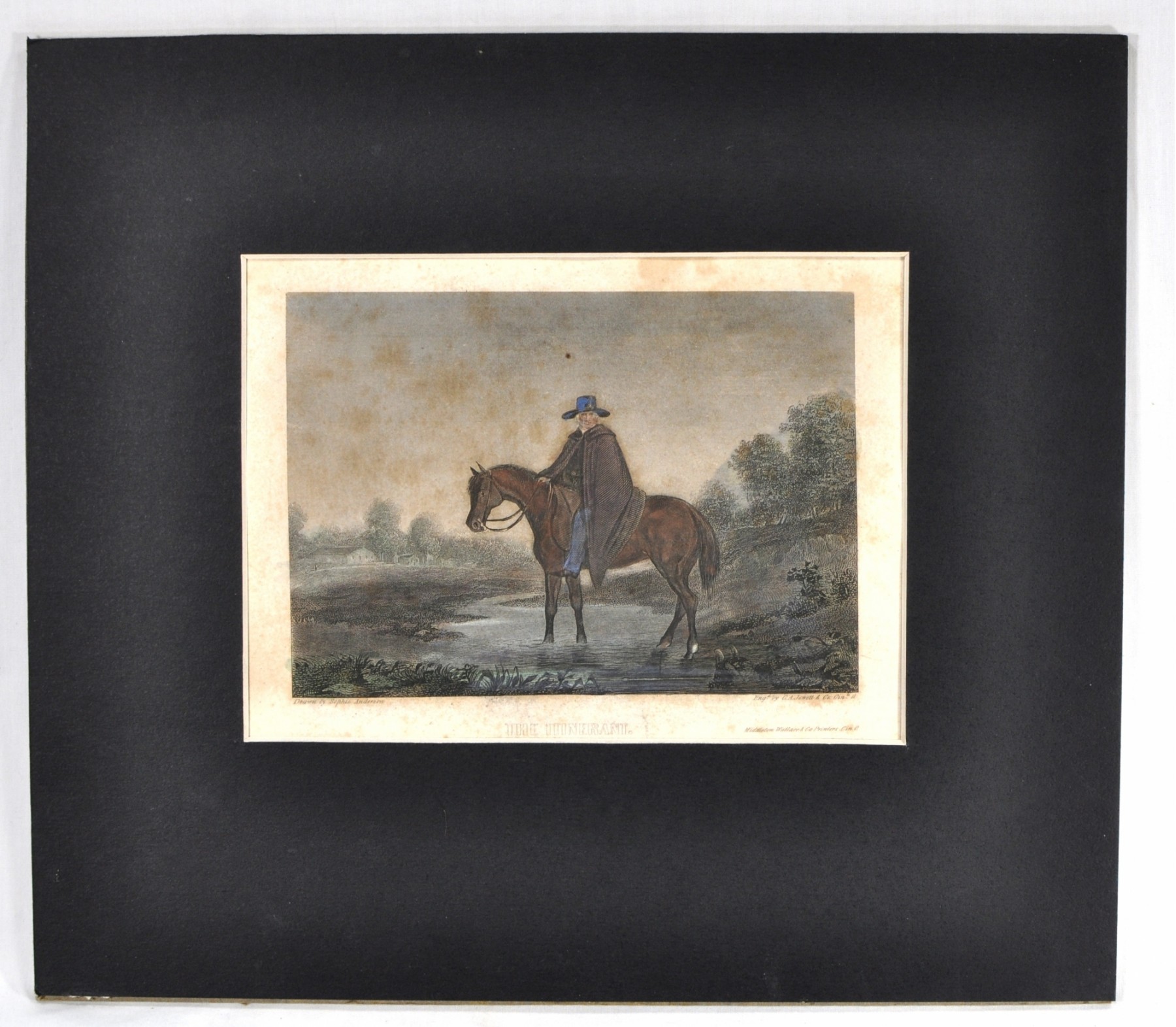 Antique etching titled "The Itinerant" by Sophie Anderson.