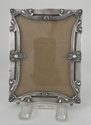 A vintage sterling silver photo frame, marked "Starling 1866 Fine." Features an Art Nouveau-style design with ornate detailing and small decorative elements. Includes a clear glass insert and a plastic easel stand.