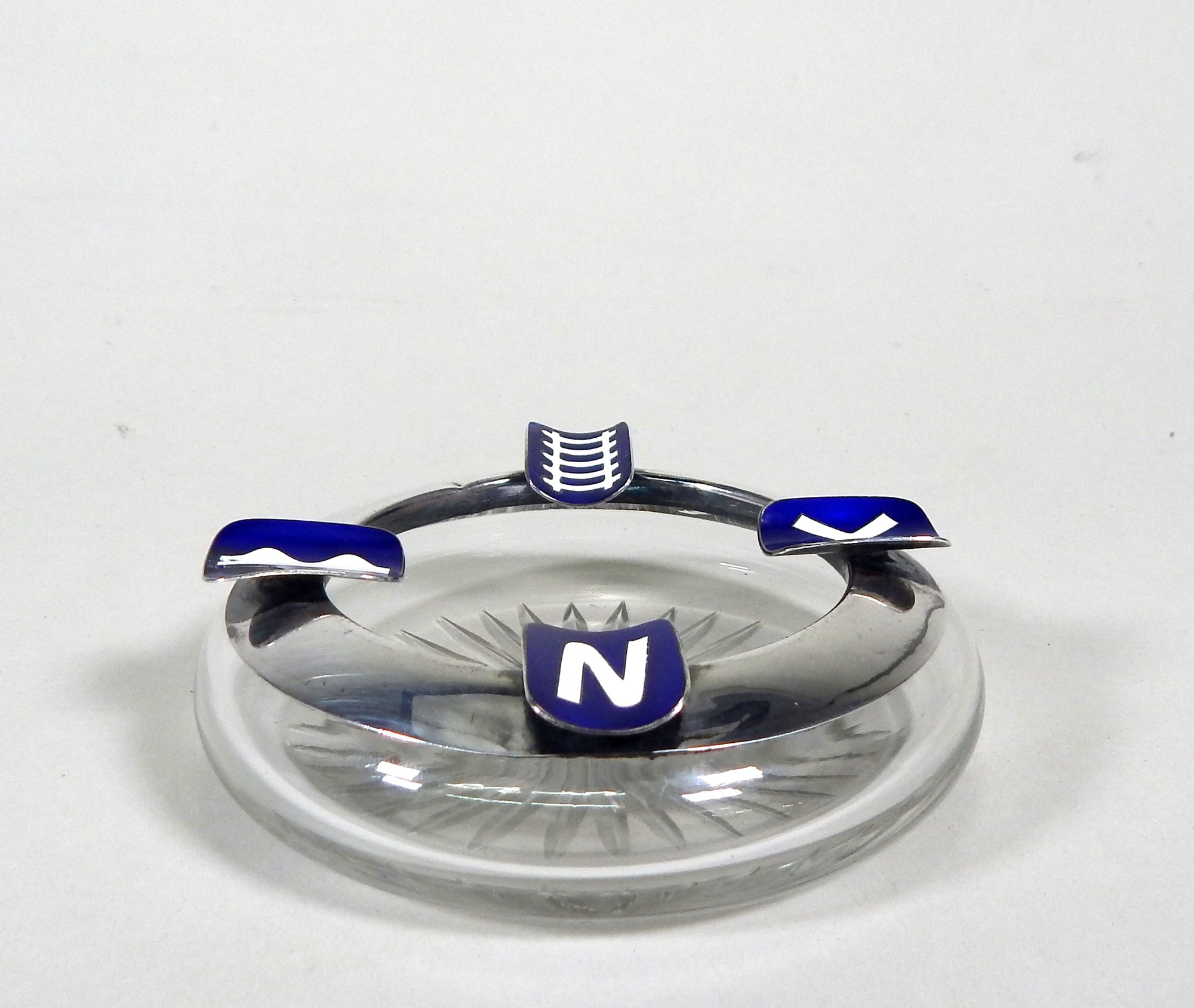 Enameled hallmarked sterling silver and glass ashtray.