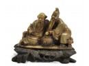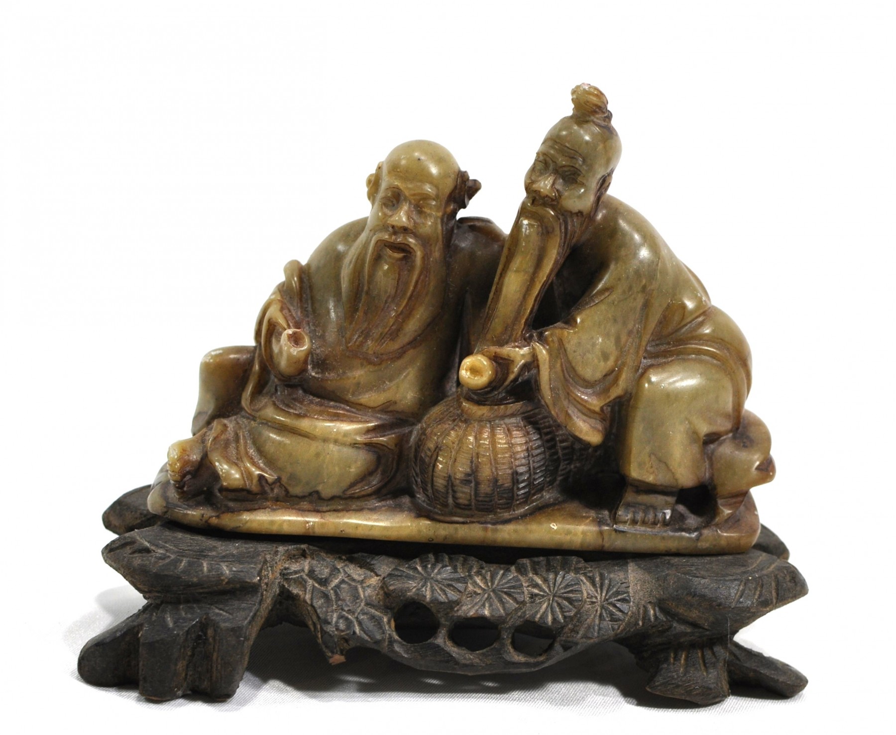 Hand carved stone sculpture on carved wood base.