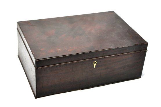 Antique wood box with hinged lid.