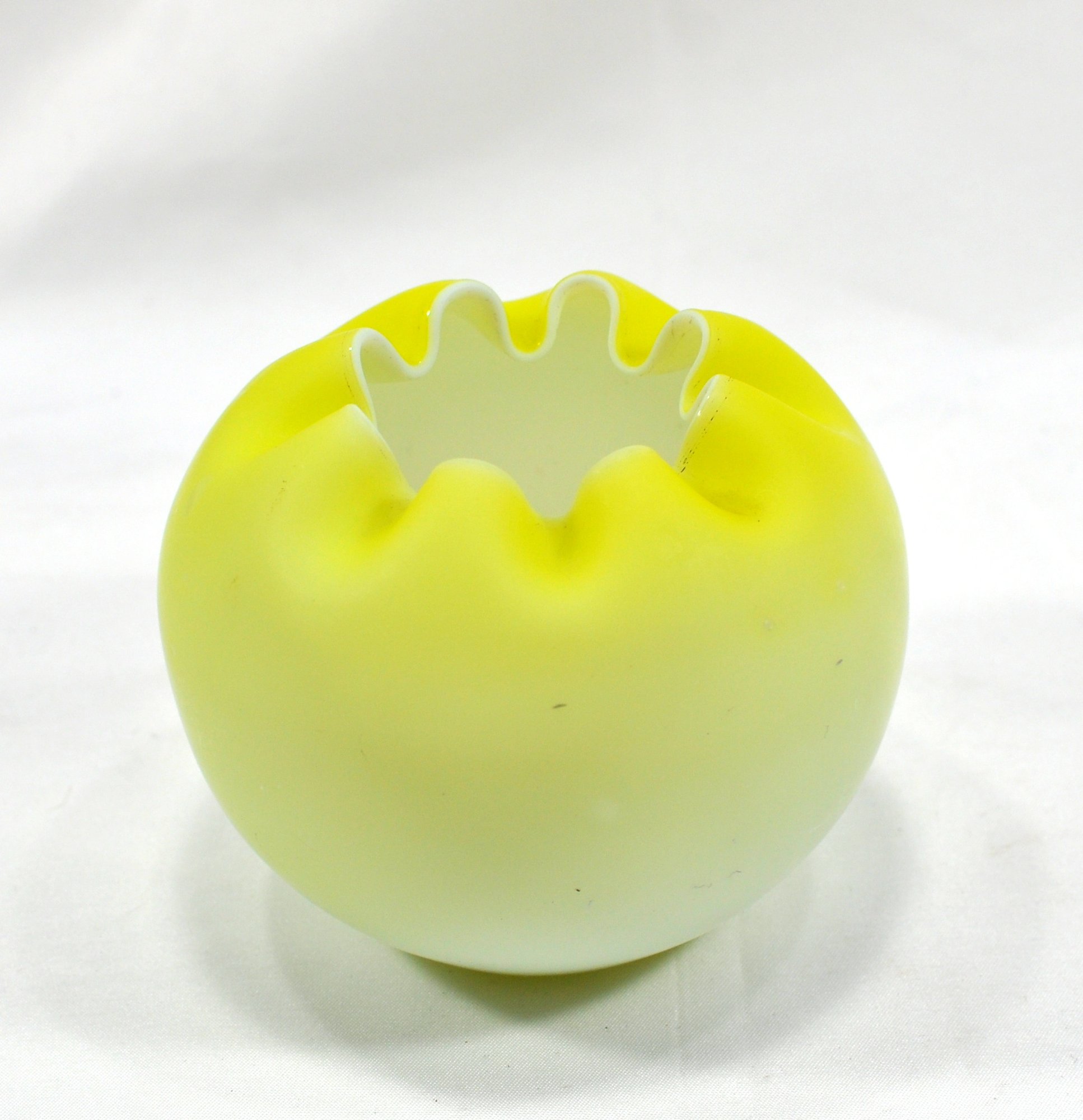 Antique Victorian Yellow Satin Glass Pinched Rim Rose Bowl Vase, measuring 4" x 3.5".