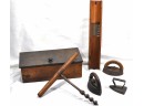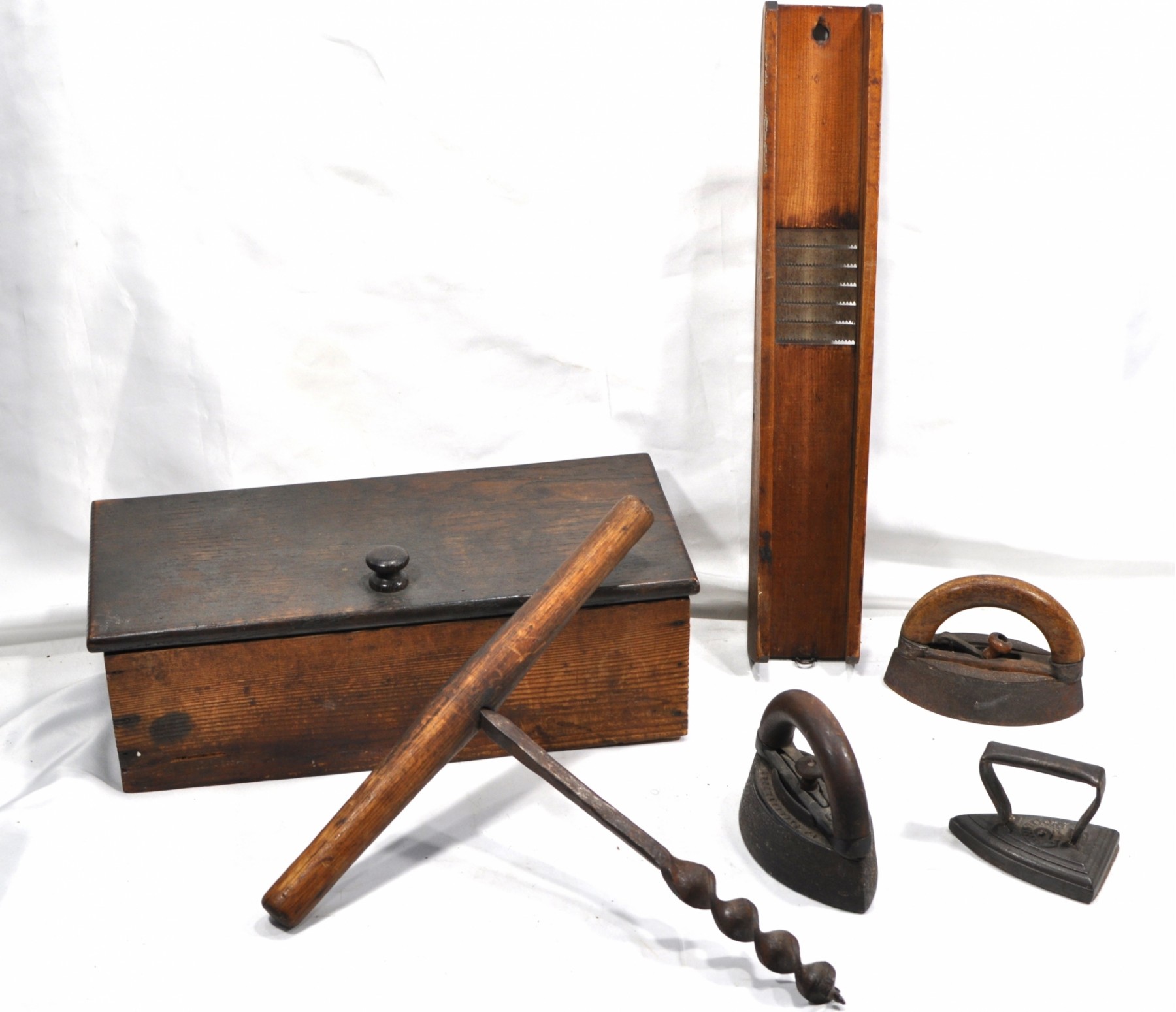 Antique wood box, tools, sad irons.
