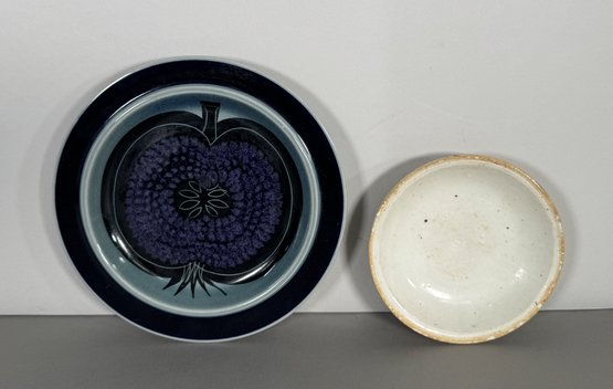 This lot features a ceramic plate from Arabia Finland alongside a handmade pottery bowl. The Arabia plate showcases a striking deep blue pomegranate motif at the center, framed by a gradient blue rim that transitions into a darker shade towards the edge. The back is marked with "Arabia Finland 909/AR," confirming its origin and production details. The plate has a glossy glaze finish, reflecting a classic Scandinavian ceramic design.