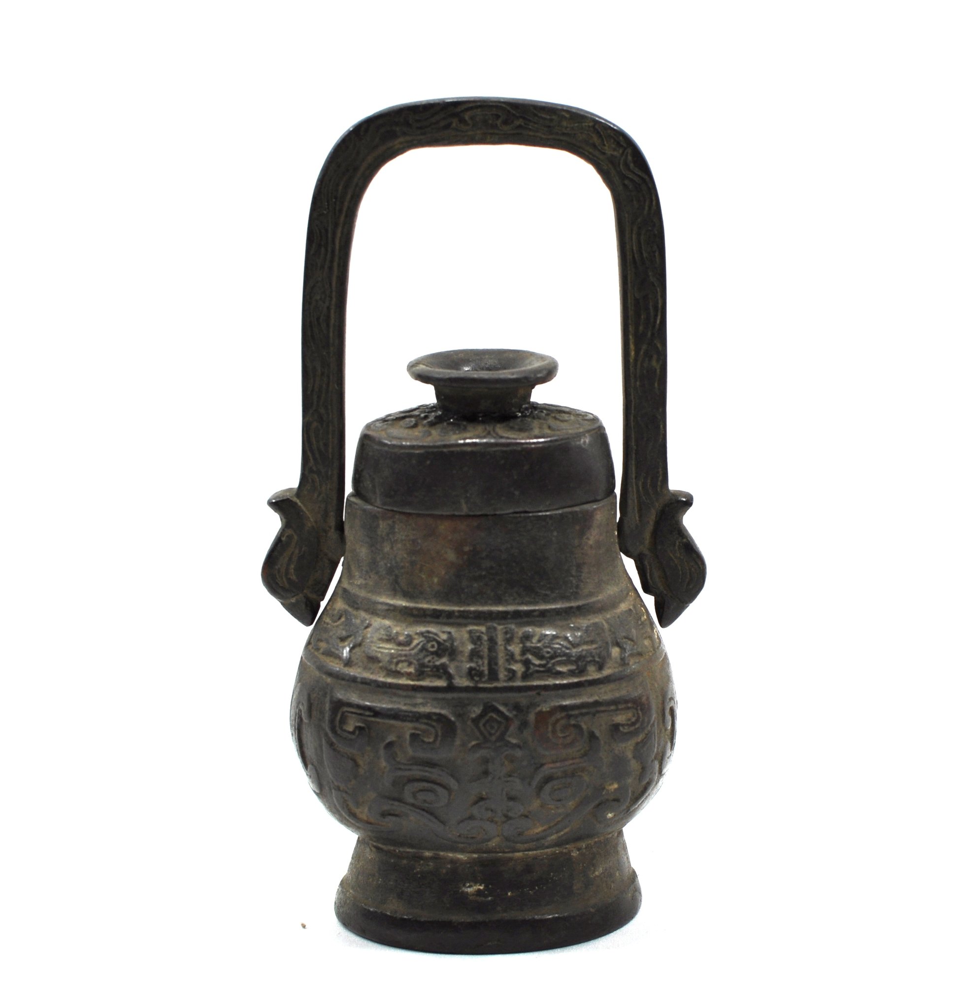 Antique bronze vessel with handle, possibly Chinese.