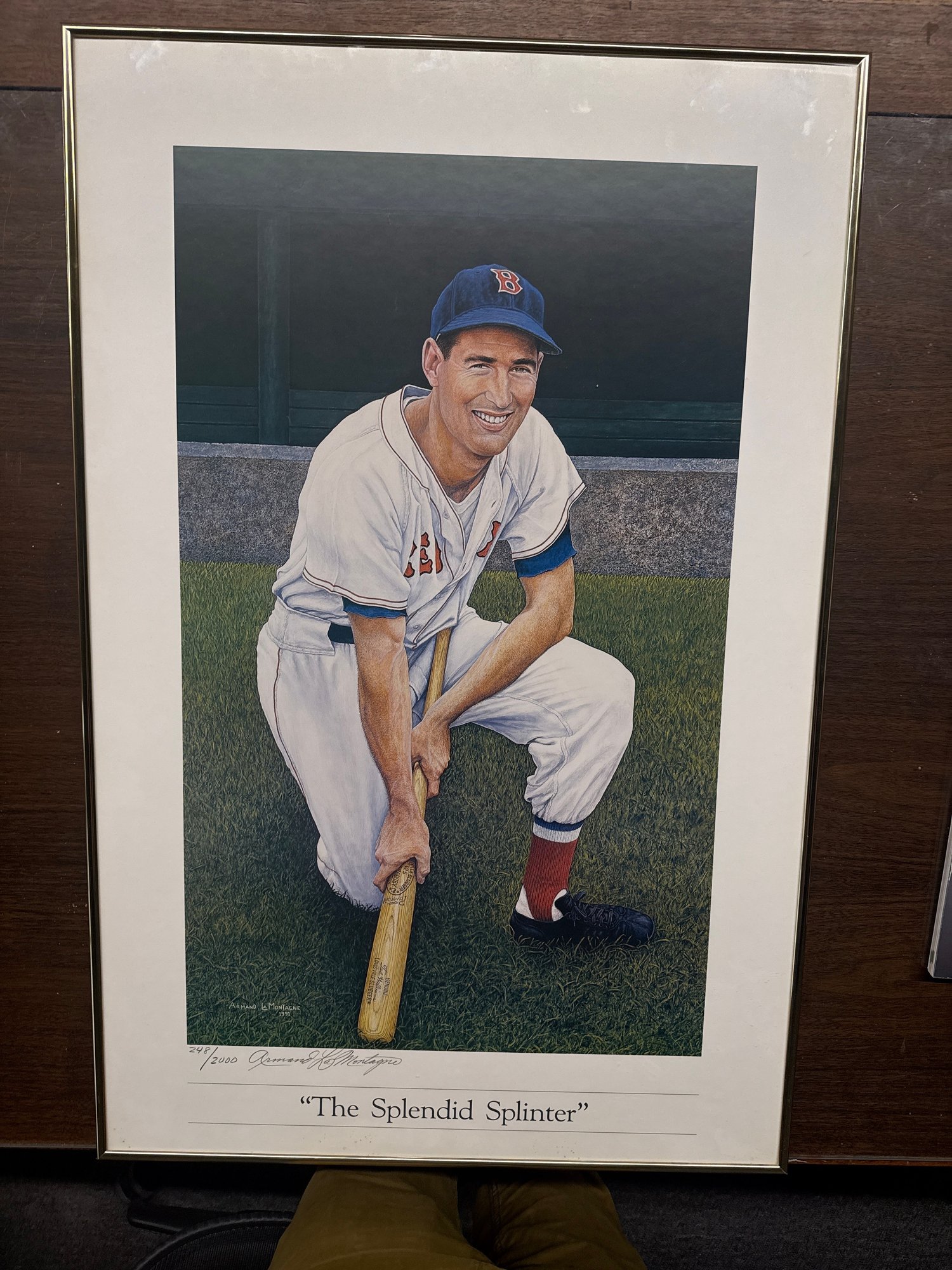 Framed and numbered print of Ted Williams, "The Splendid Splinter", by Armand La Montagne. Numbered 248/2000 and signed by the artist. Depicts Williams in a classic batting pose. Dimensions: 35'' x 23''.