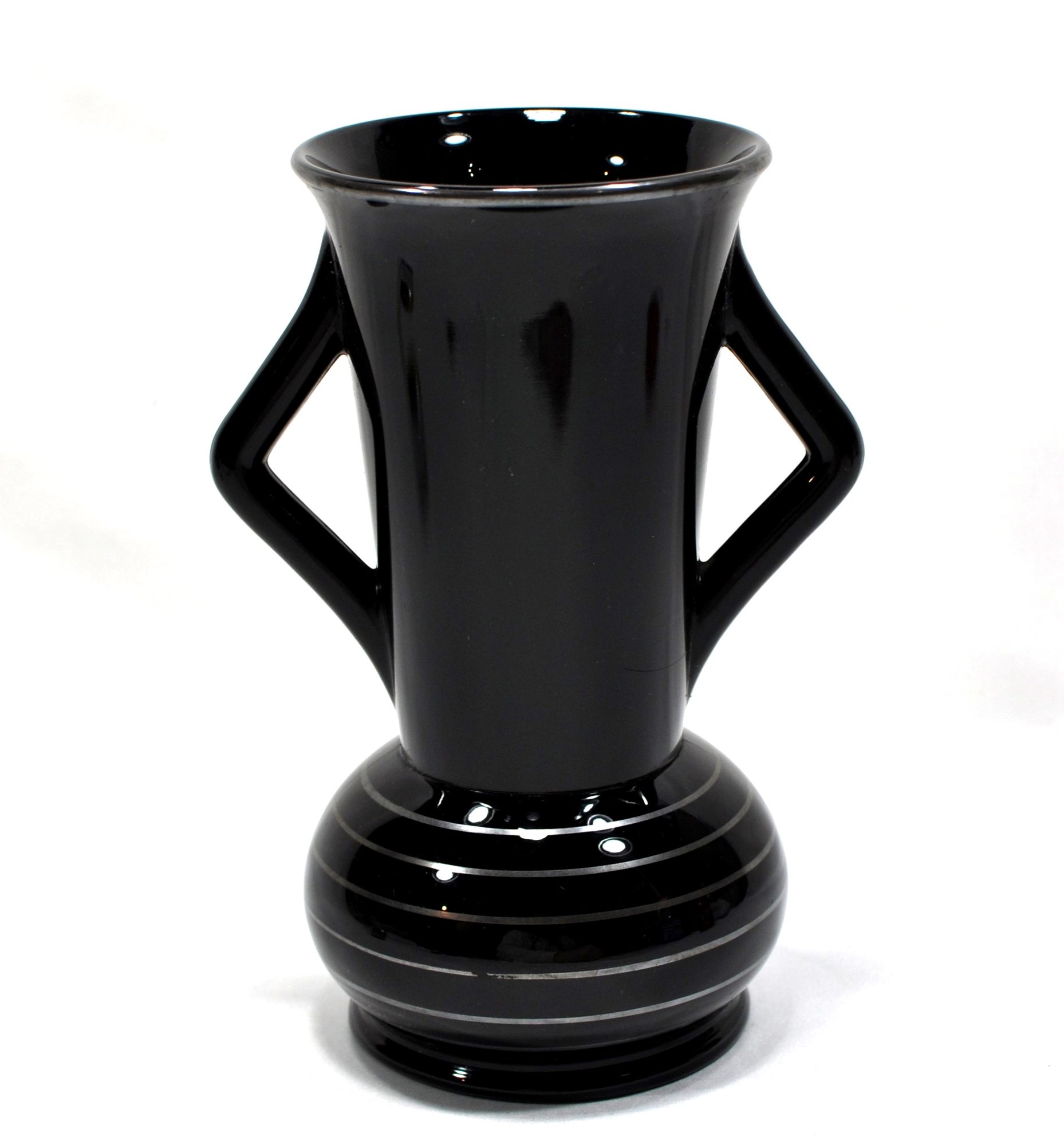 Two handled and silver trimmed around top and concentric circles around base.
