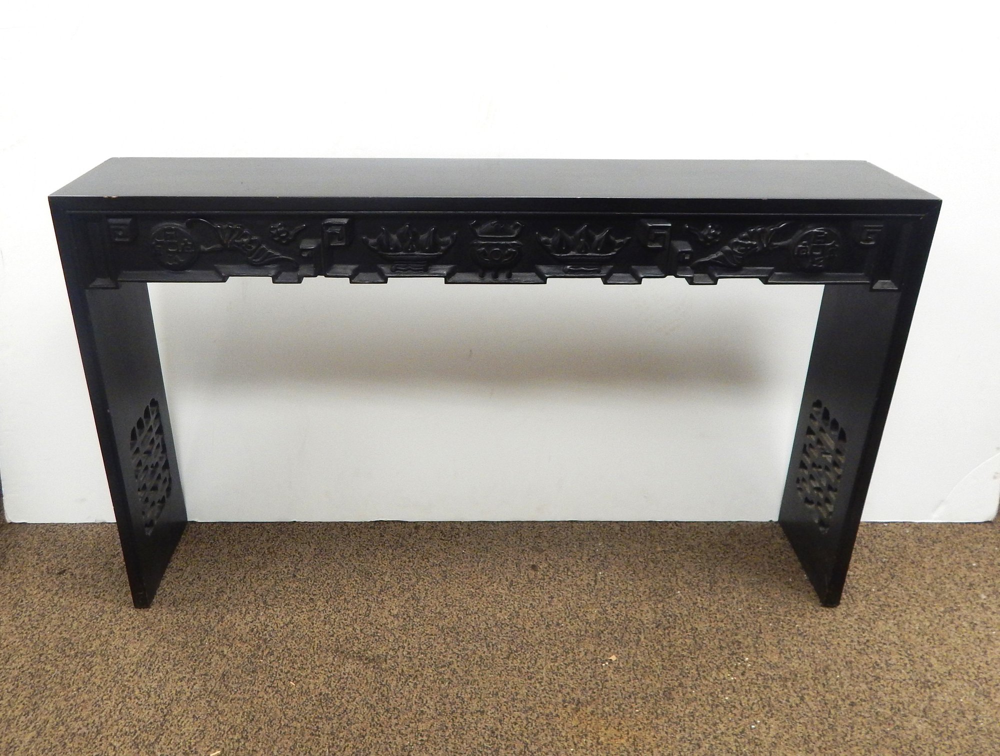 Console table with an Asian influence. Measures: 47.5"w x 9.5"d x 28"h. Some discoloration & scratches on the top consistent with use, but condition is still good.