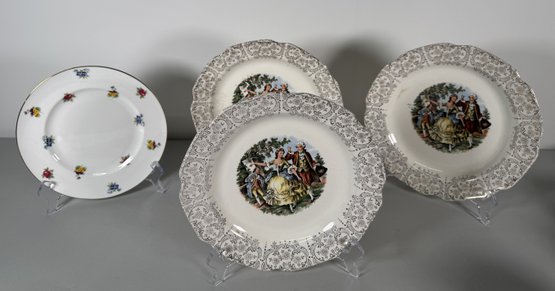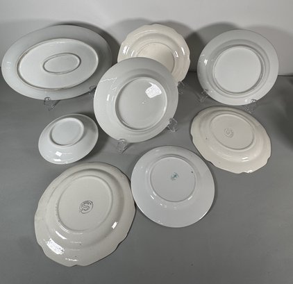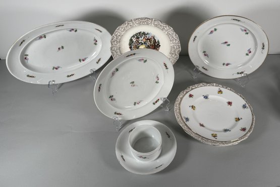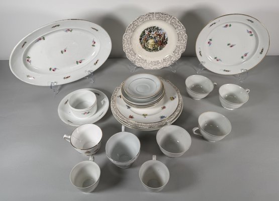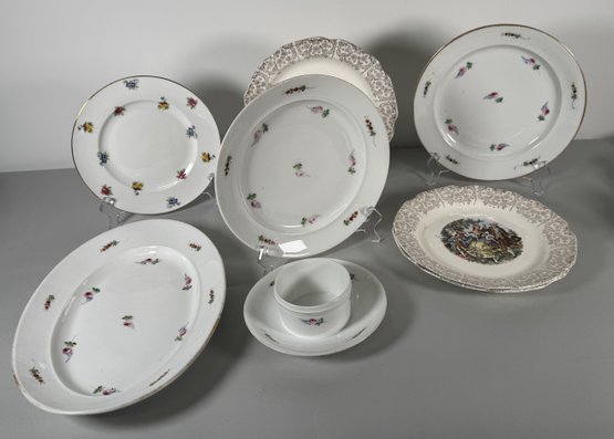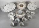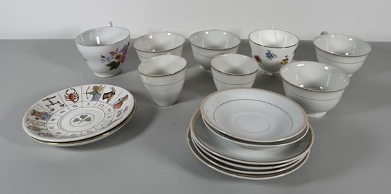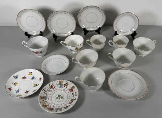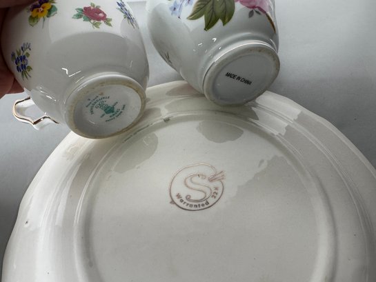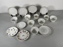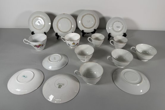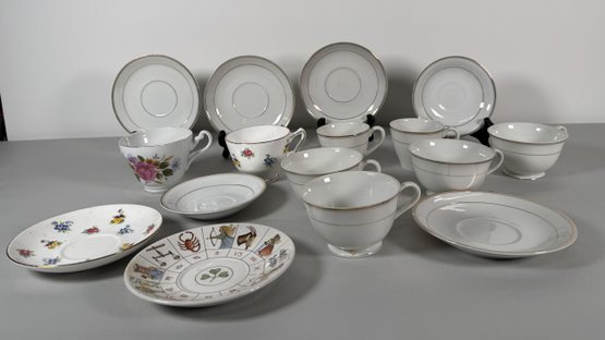 Collection of assorted china tableware including cups, saucers, and plates. Some pieces feature floral designs. Largest item measures approximately 14.75 inches.